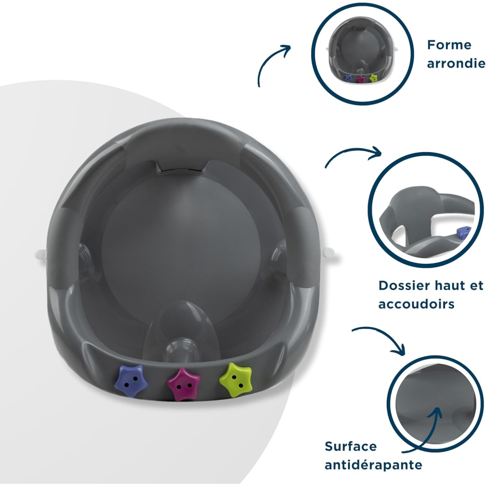 L’Anneau de bain aquababy gris Thermobaby est un siège de bain conçu pour accompagner les premiers bains assis de bébé, à partir du moment où il sait se tenir assis seul jusqu’à ce qu’il tente de se lever. Il offre un maintien enveloppant grâce à sa forme ronde avec dossier et accoudoirs, et sécurise l’enfant avec une surface antidérapante et 4 ventouses puissantes pour une fixation stable dans la baignoire. Trois petits jeux éducatifs intégrés à l’avant participent à l’éveil de bébé et rendent le moment du bain plus agréable. Léger, compact et facilement transportable, il s’intègre facilement dans la salle de bain et se retire aisément grâce aux languettes prévues pour décoller les ventouses. Ce produit est fabriqué en France et répond à la norme EN 17022:2018 relative aux articles de bain pour enfants.