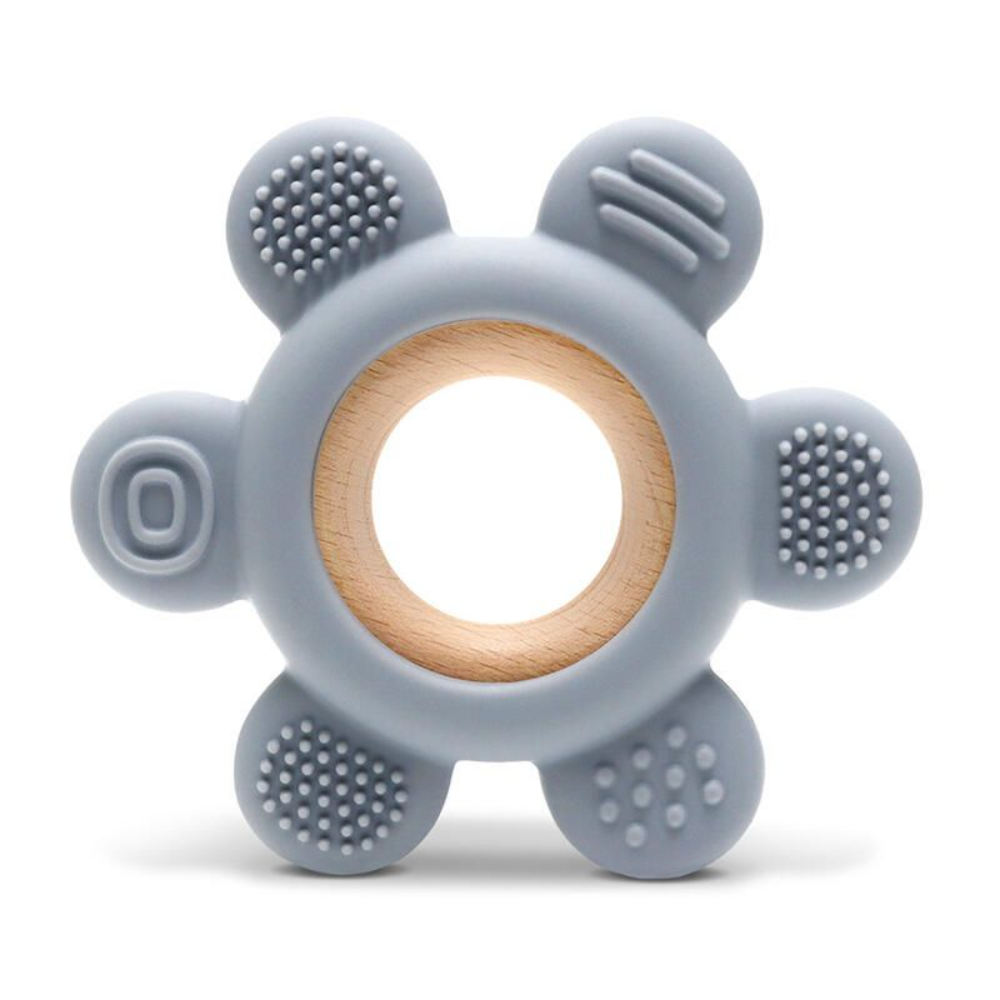L’Anneau de dentition fleur gris de Lorelli est conçu pour soulager efficacement les gencives douloureuses de bébé lors des poussées dentaires tout en favorisant le développement de sa motricité et de sa préhension. Il est composé d'un anneau principal en silicone en forme de fleur avec des pétales texturés différents, permettant à l’enfant de choisir la surface qui le soulage le mieux. Au centre, un anneau en bois de hêtre lisse est intégré pour offrir une surface plus dure à mâcher.