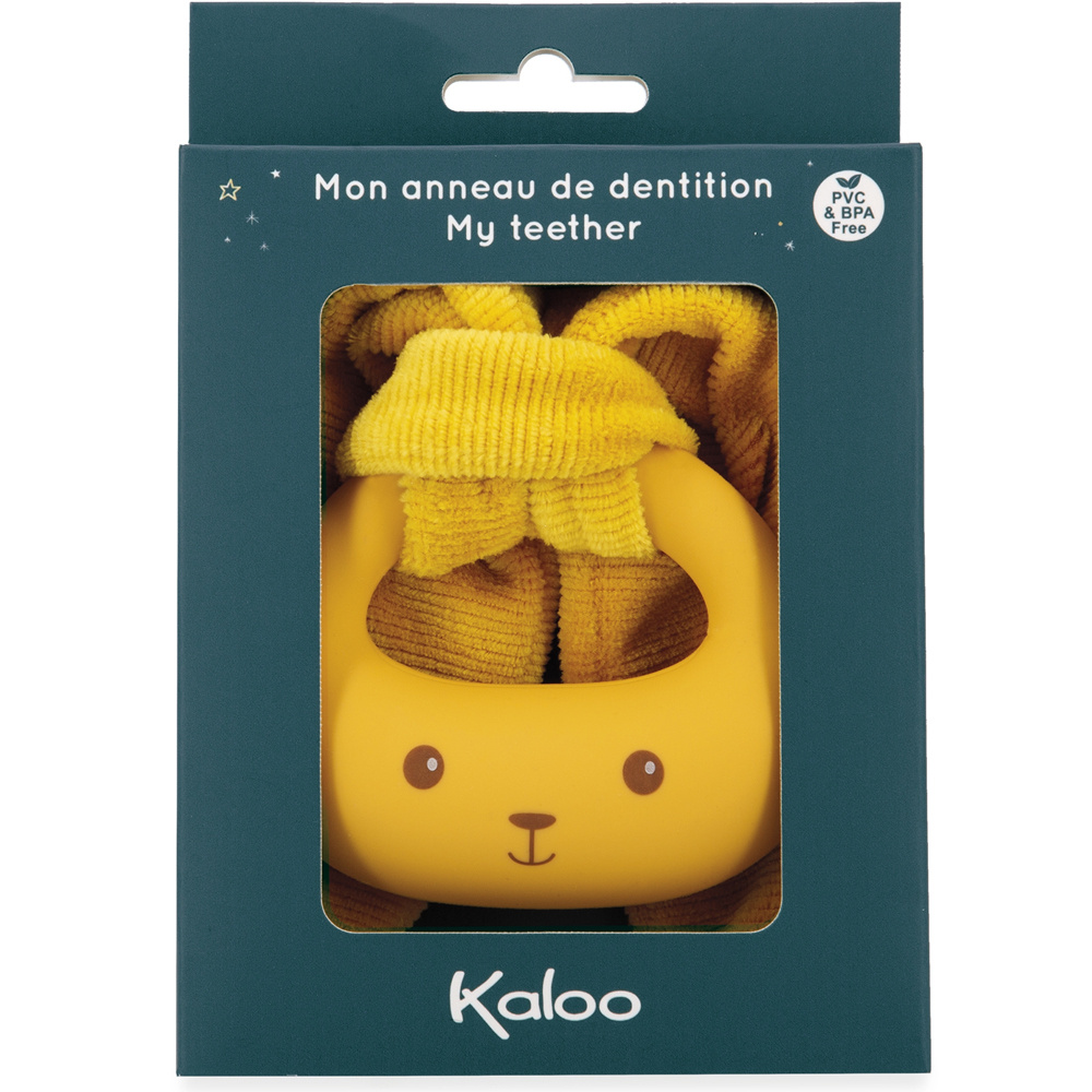 Anneau de dentition lapin en silicone ocre de la marque Kaloo. Pour bien nettoyer l'anneau, les oreilles du lapin sont détachables. La forme de l'anneau est conçue pour s'adapter à la bouche de votre bébé. L'anneau est composé de 2 textures différentes : un côté lisse et un autre avec des picots pour masser les gencives de votre nourrisson. Les oreilles du lapin sont toutes douces.