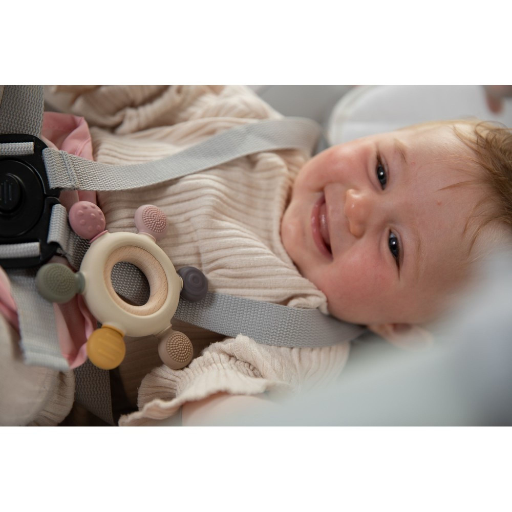 Fabriqué en silicone et en bois sûrs et durables, ce hochet à macher est parfait pour calmer les douleurs de dentition tout en offrant des heures de divertissement. La partie en silicone de l’anneau présente une variété de textures et de formes, soulageant les gencives sensibles de votre bébé et stimulant ses sens au fur et à mesure qu’il explore. Avec son design coloré et tendance, cet anneau multisensoriel plaira autant aux bébés qu'aux parents ! C’est le compagnon idéal des premières aventures de votre bébé.