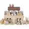 - Contient : 1 arche, 1 Noé, 1 femme, 2 lions, 2 éléphants, 2 zèbres, 2 singes, 2 pigeons, 2 crocodiles, 2 tortues, 2 girafes, 2 autruches, 2 vaches, 1 poule et 1 coq