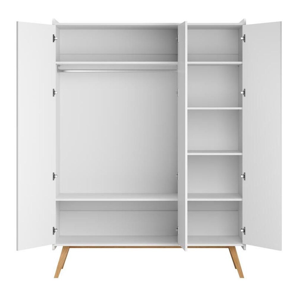 Armoire 3 portes vintage blanc de la marque Vox. Les pieds donnent un effet vintage des années 50 à cette belle armoire. Dans cette armoire, vous retrouverez deux espaces de rangements : un côté penderie avec une barre de suspension et un autre côté avec 4 étagères.