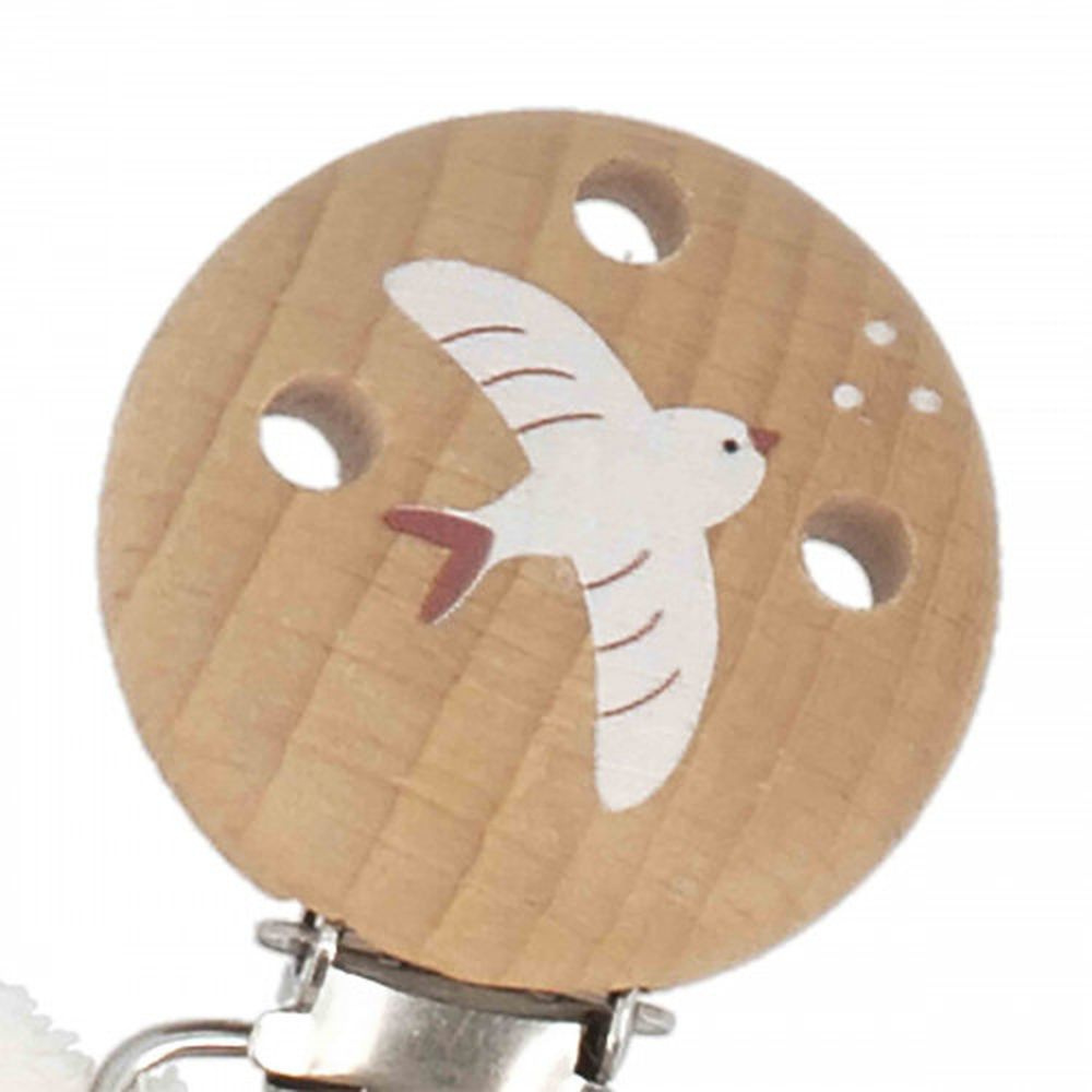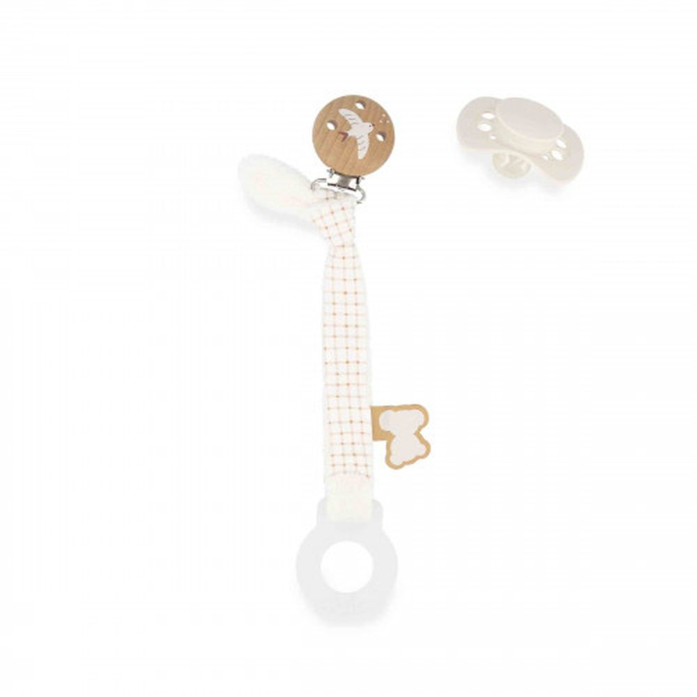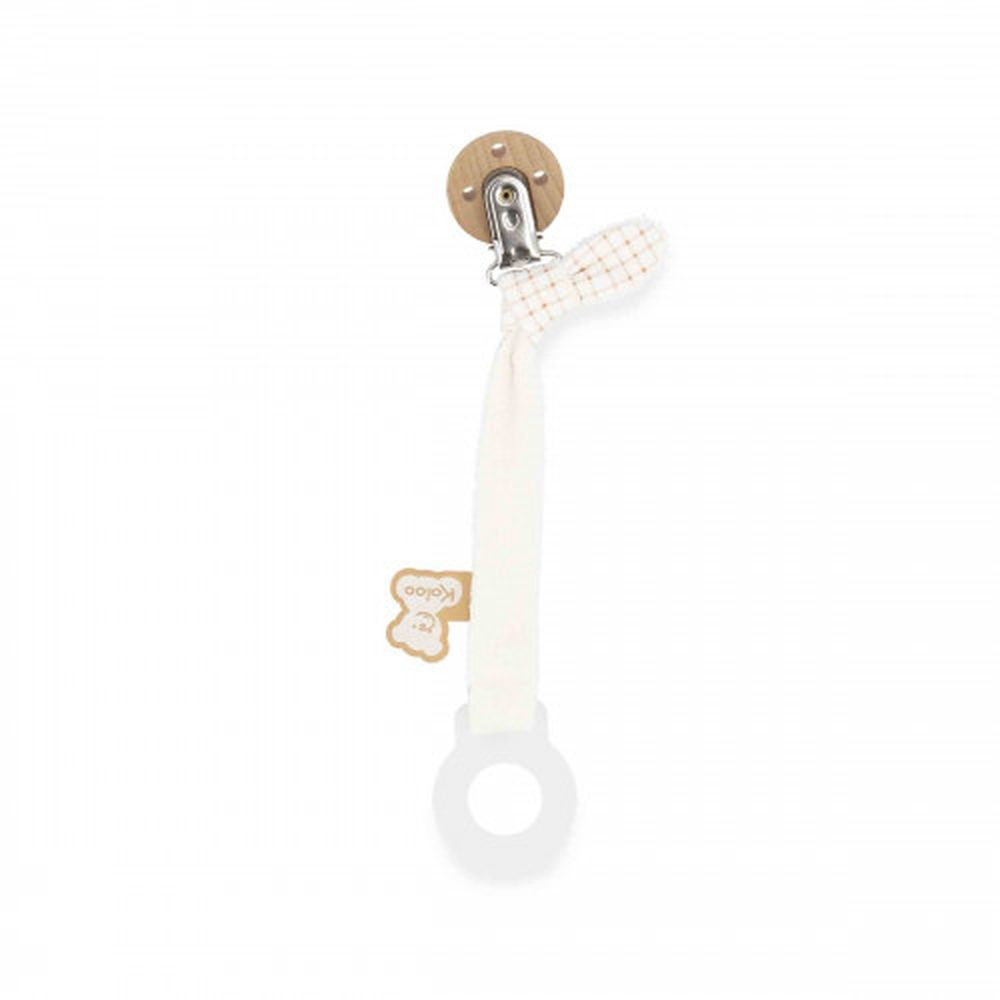 Attache tétine crème de la marque Kaloo. C'est le produit indispensable pour que votre bébé puisse avoir sa sucette toujours à proximité. Cela le permet de le rassurer. Sur l'attache sucette, il y a des motifs pour apporter une touche de poésie et de douceur. Ce produit convient aux sucettes sans anneau.