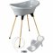 La Baignoire vasco 5 en 1 - gris velours Thermobaby est un ensemble de bain complet conçu pour offrir un espace de toilette stable, confortable et ergonomique pour le bébé tout en facilitant le quotidien des parents. Il comprend une baignoire VASCO, un pied en bois pliable spécifiquement adapté et un tuyau de vidange permettant de vider l’eau sans effort après le bain, mais également un transat spécialement conçu pour respecter la morphologie de bébé et un thermometre. Sa baignoire en forme de vasque, aux bords larges et arrondis, limite les risques de glissade ou de sortie du bébé, et peut accueillir un transat de bain compatible pour un meilleur maintien dès la naissance. Le système d’accroche en croix sous la baignoire assure une fixation sécurisée au support, pour une très bonne stabilité lors de l’utilisation. Le pied en bois, léger et design, se plie facilement pour un rangement peu encombrant, par exemple derrière une porte, ce qui en fait une solution adaptée aux petites salles de bain. Le kit est fabriqué en France et respecte la norme EN 17072:2018 relative aux articles de bain pour enfants, l’utilisation sur pied étant recommandée jusqu’à ce que l’enfant tente de se tenir debout seul.