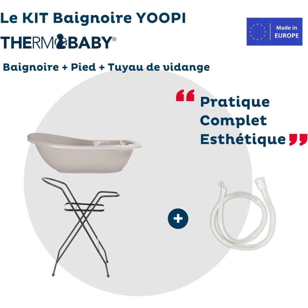 La baignoire est compatible avec divers transats de bain Thermobaby, permettant d'accueillir les nouveau-nés en position allongée, et respecte la norme de sécurité EN 17072:2018 pour une utilisation sereine. Fabriqué en polypropylène résistant avec système de croix en polyamide renforcé, cet ensemble allie durabilité, gain de place et confort, idéal pour la salle de bain ou les voyages occasionnels.