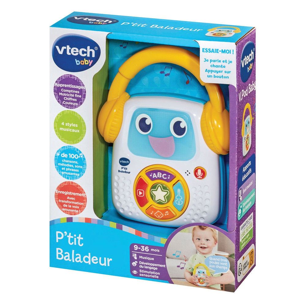 Optez pour le P'tit baladeur de la marque Vtech ! Ce baladeur ludique et facile à utiliser permet à Bébé d'emporter sa musique partout avec lui. Avec ses 3 modes d'écoute, il découvre des chansons, des comptines et même des morceaux de musique classique. En plus, il peut s'enregistrer et écouter sa voix transformée en voix de robots pour encore plus de fun ! Le visage lumineux du robot s'illumine au rythme de la musique, rendant chaque moment encore plus captivant.