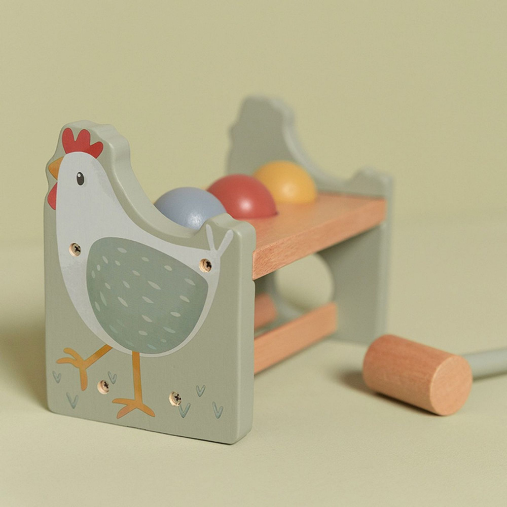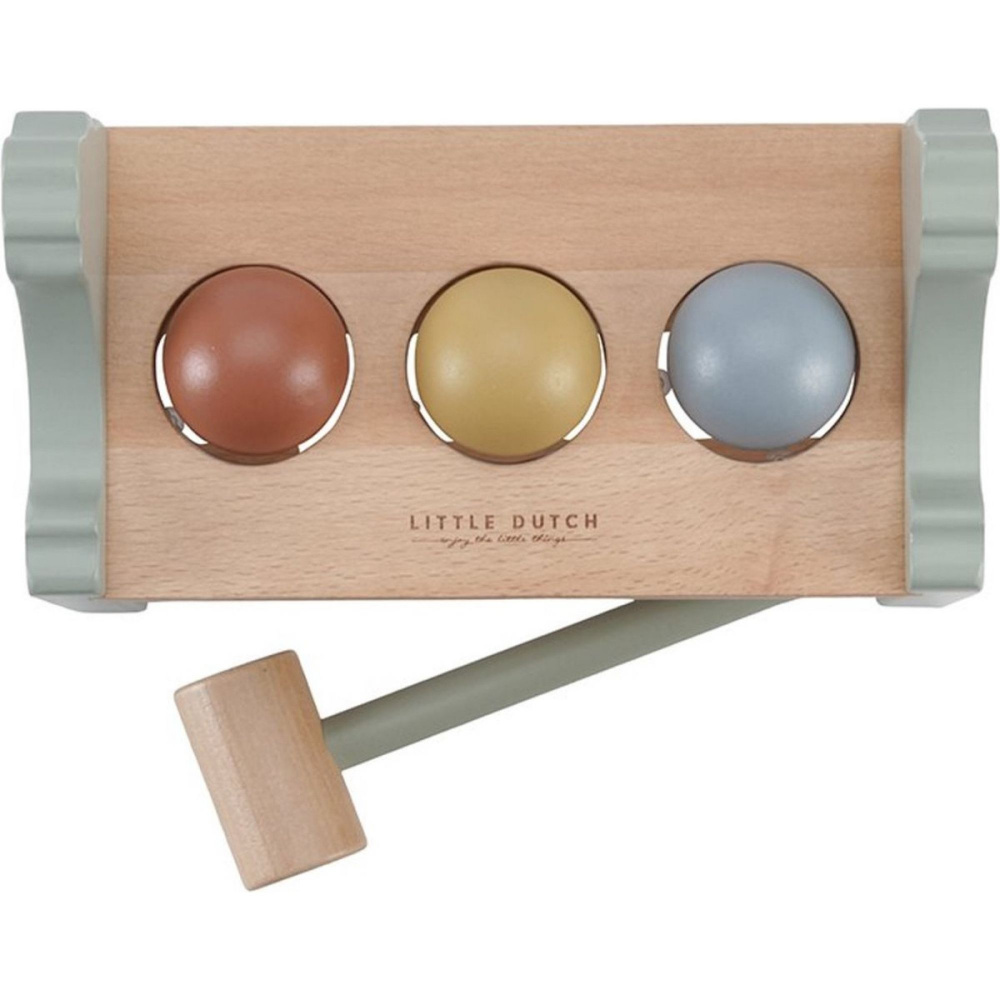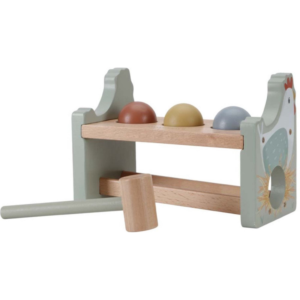 Le Banc à marteler en bois fsc - little farm de chez Little Dutch. Le jouet se compose d'un banc en bois avec trois trous et d'un marteau en bois. Les enfants doivent frapper les balles colorées dans les trous avec le marteau. Une fois que toutes les balles sont dans les trous, les enfants peuvent les remettre en place et recommencer.
