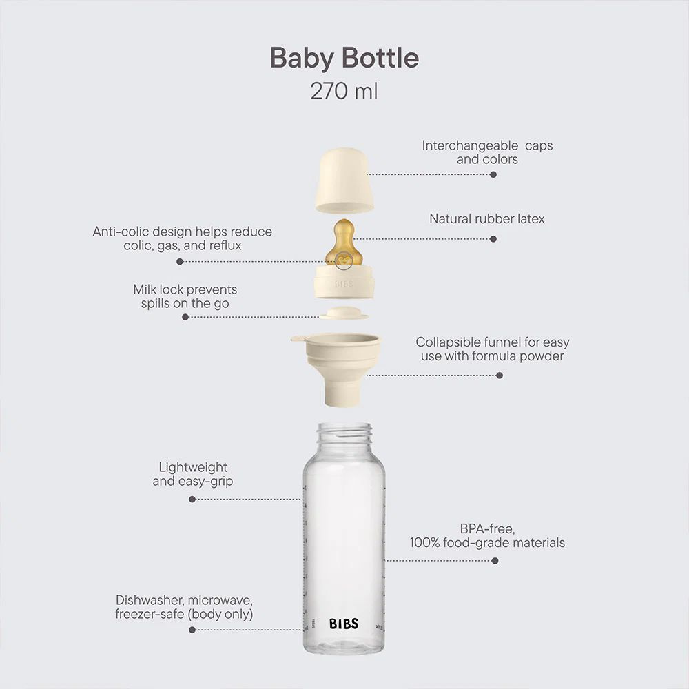 Optez pour le Biberon 270ml bibs de chez BIBS. Il est utilisable dès la naissance grâce à sa tétine débit lent. Fabriqué polypropylène SANS BPA , ce set composé d'un biberon, d'un capuchon, d'une bague de vissage, d'une tétine en latex à débit lent, d'un verrouillage anti fuite et d'un entonnoir pliable est parfait pour passer du sein à la tétine, ou pour les premiers biberons.