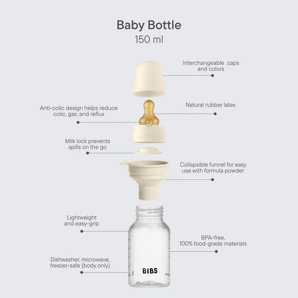 Optez pour le Biberon anti colique 150 ml ivoire + tétine latex de chez BIBS. Il est utilisable dès la naissance grâce à sa tétine débit lent. Fabriqué polypropylène SANS BPA , ce set composé d'un biberon, d'un capuchon, d'une bague de vissage, d'une tétine en latex à débit lent, d'un verrouillage anti fuite et d'un entonnoir pliable est parfait pour passer du sein à la tétine, ou pour les premiers biberons.