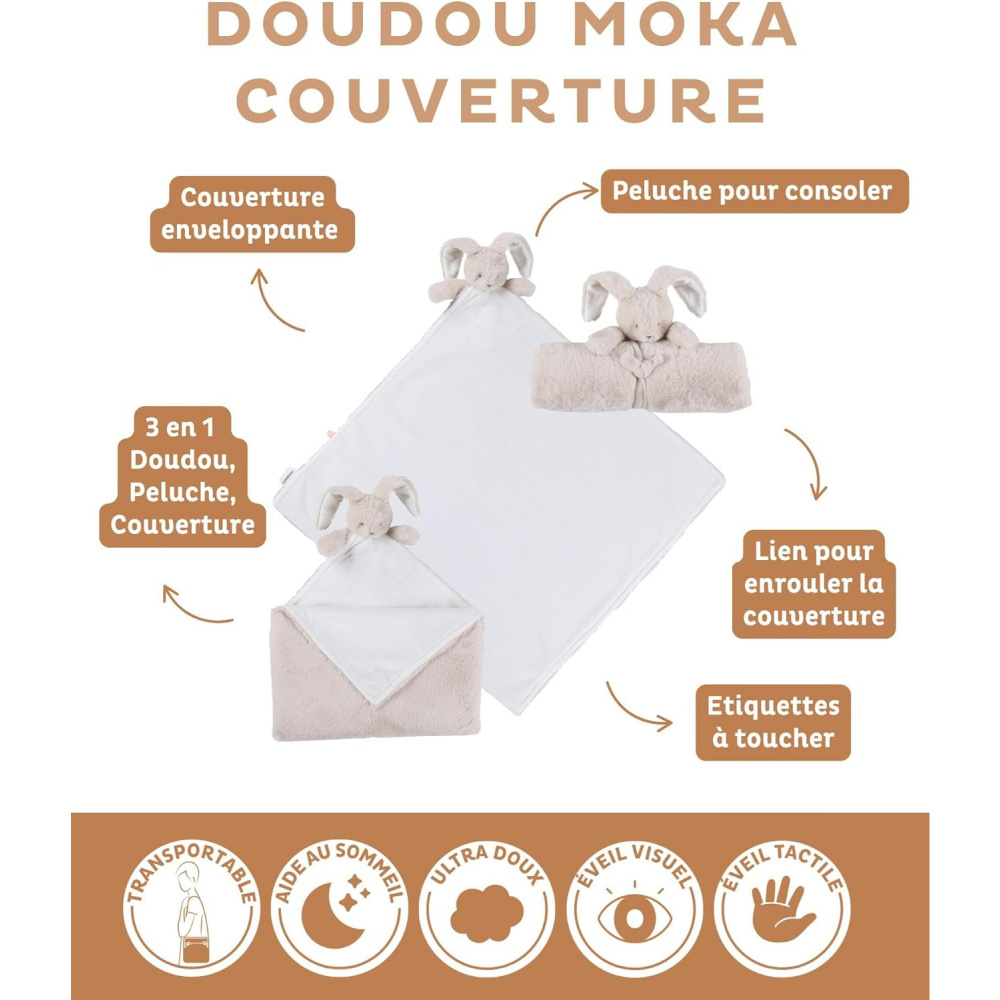 Un doudou tout doux avec couverture pour rassurer bébé et l’accompagner dès la naissance . Le doudou Moka de Noukie’s Ma première couverture est parfait pour accompagner bébé au quotidien. Grâce à sa couverture douce et à sa texture veloudoux, il apporte confort et réassurance, notamment lors des moments de séparation ou du coucher. Facile à manipuler, il devient rapidement le compagnon préféré de bébé.