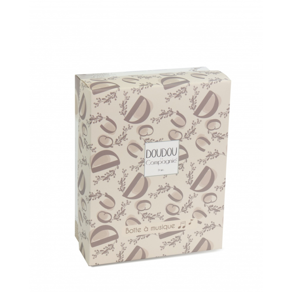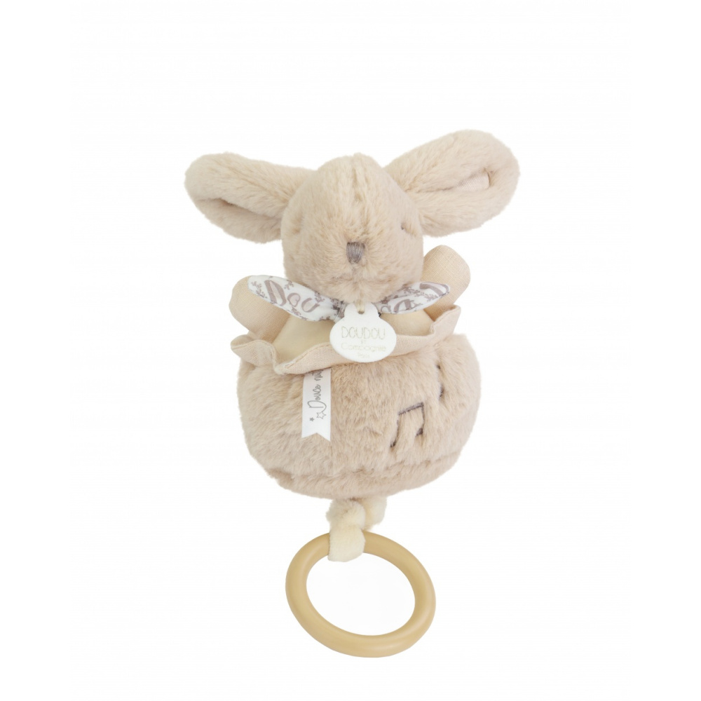 Boîte à musique lapin doudou beige de la marque Doudou et Compagnie. Votre enfant va adorer tirer sur le cordon du doudou lapin et déclencher la mélodie douce et apaisante. Ce produit es très doux. Vous pourrez accrocher ce doudou au lit de votre enfant ou à la poussette.