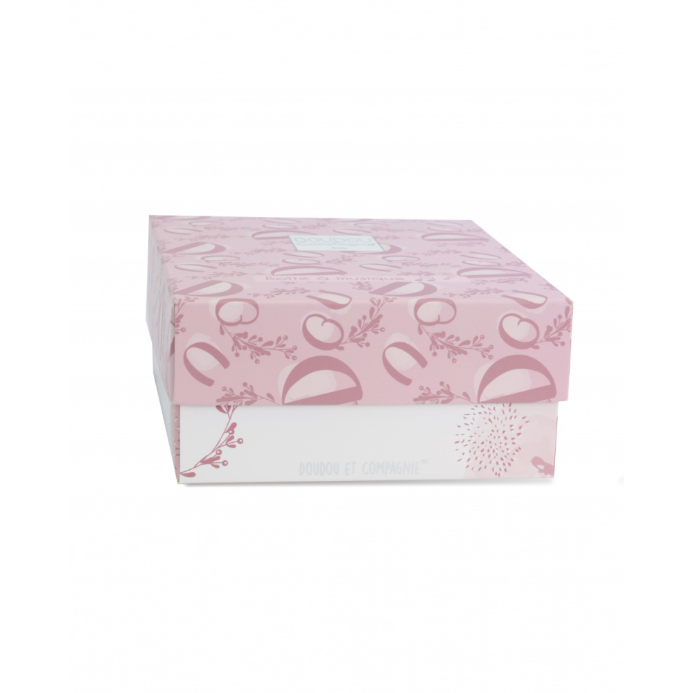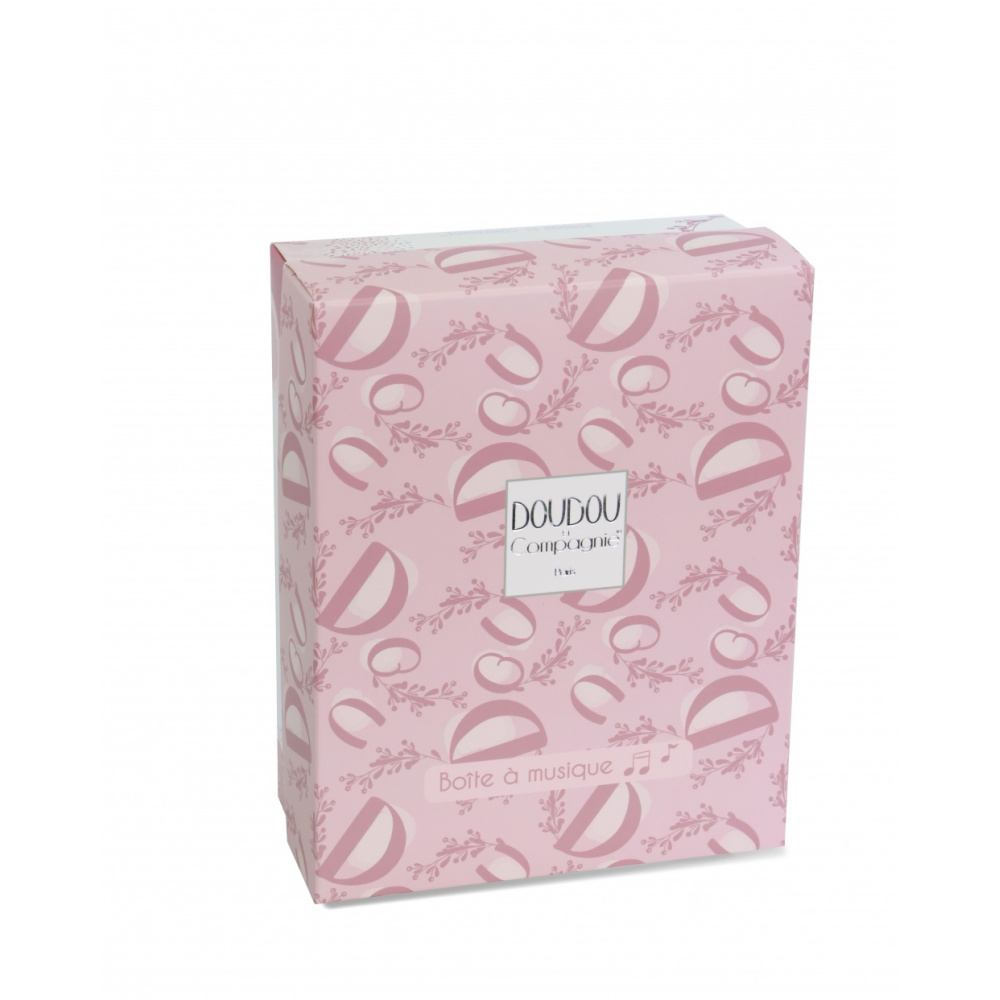 Boîte à musique lapin doudou rose de la marque Doudou et Compagnie. Votre enfant va adorer tirer sur le cordon du doudou lapin et déclencher la mélodie douce et apaisante. Ce produit es très doux. Vous pourrez accrocher ce doudou au lit de votre enfant ou à la poussette.
