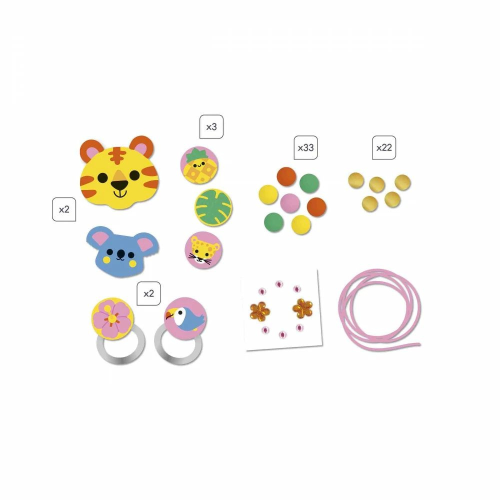 Boîte de 4 bijoux en bois à créer secret jungle de la marque Janod. Votre enfant va créer à sa guise les 4 bijoux. Une fois créer, il pourra mettre le collier autour du cou et les bagues aux doigts. La boîte se transforme en boîte de transport. Dans ce jeu créatif, votre enfant va fabriquer 1 collier, 1 bracelet et 2 bagues. Le coffret créatif est composé de : 2 perles en bois silhouettées et imprimées, 3 perles en bois rondes et imprimées, 33 perles en bois rondes et colorées, 22 perles en bois dorées, 2 bagues avec perles en bois plates et imprimés, 1 planche de 8 strass et 1 fil élastique.