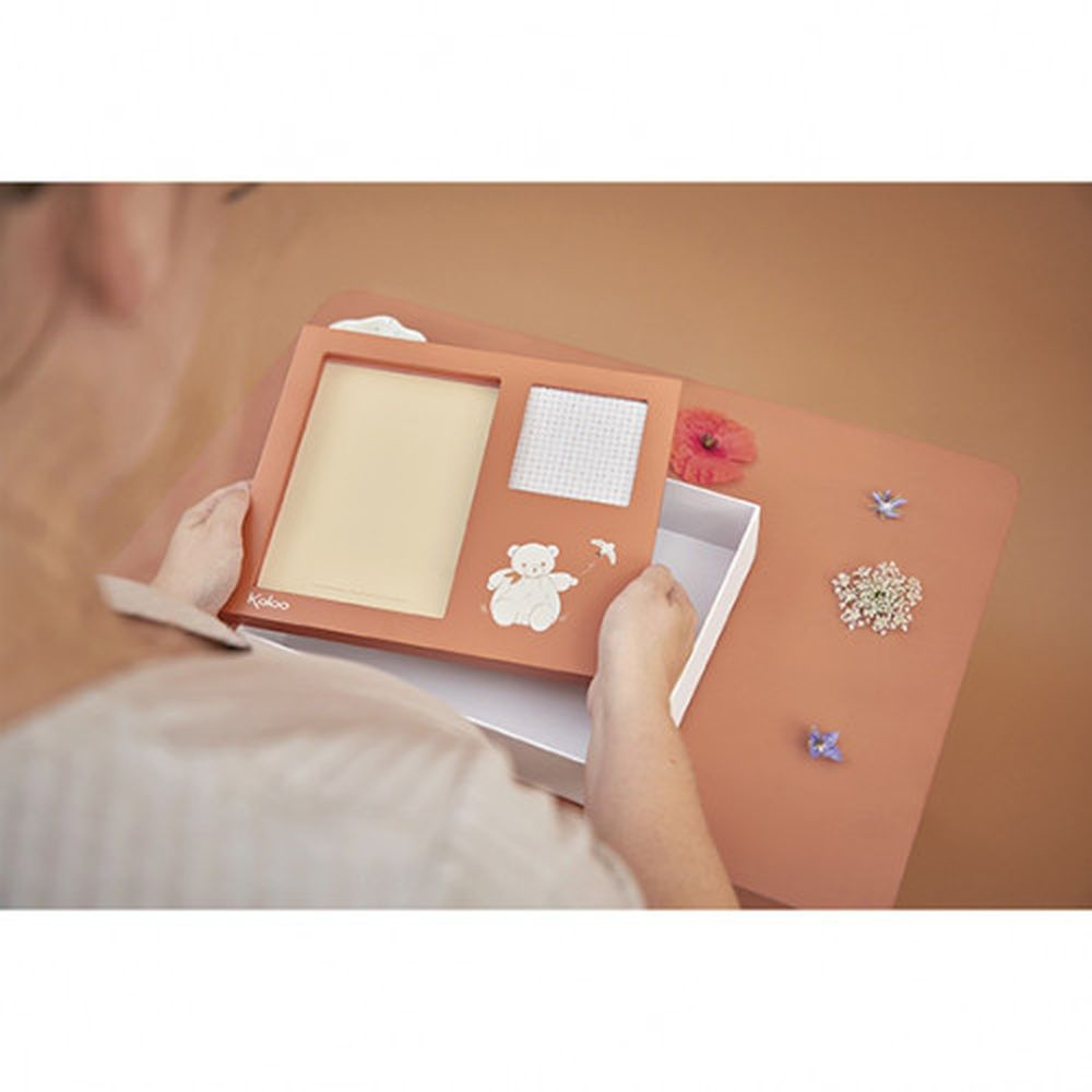 Cadre à souvenirs photo et empreinte enfant terracotta de la marque Kaloo. Grâce à ce cadre, vous immortalisez les premiers moments de vie de votre enfant. Ce cadre permet de garder en souvenir une photo et une empreinte (main ou pied) de votre bébé. Pour vous aider à réaliser le moulage en argile, le mode d'emploi est inclus. Ce produit peut aussi se fixer au mur avec les crochets et est livré dans une belle boîte.