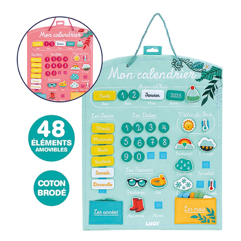 Calendrier semainier éducatif amande de la marque Ludi. Ce calendrier est parfait pour accompagner votre enfant dans l'apprentissage du temps. Il pourra renseigner la date du jour, l'année en cours, la météo ainsi que la saison. Deux poches sont prévues sur le calendrier pour ranger les éléments quand votre enfant ne s'en sert pas. Les éléments sont parfaitement adaptés aux petites mains des enfants.