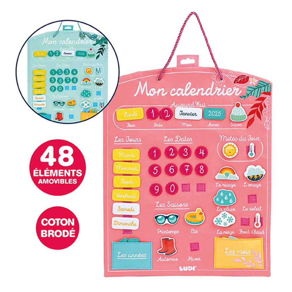 Calendrier semainier éducatif corail de la marque Ludi. Ce calendrier est parfait pour accompagner votre enfant dans l'apprentissage du temps. Il pourra renseigner la date du jour, l'année en cours, la météo ainsi que la saison. Deux poches sont prévues sur le calendrier pour ranger les éléments quand votre enfant ne s'en sert pas. Les éléments sont parfaitement adaptés aux petites mains des enfants.