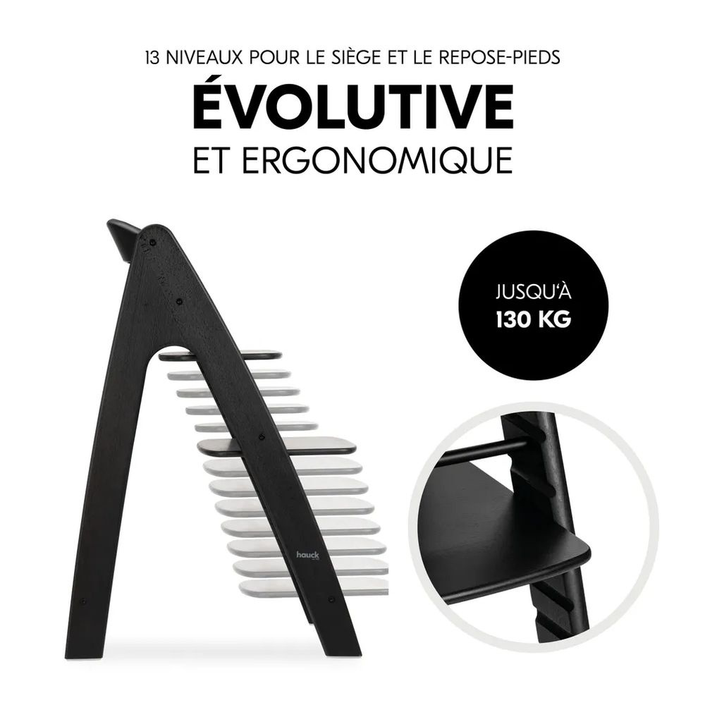 La chaise haute évolutive Arketa N Play de la marque Hauk est l'accessoire idéal pour que votre enfant soit confortablement installé. Il pourra donc partager les repas et moments importants avec toute la famille dans sa jolie chaise en bois. Le bois est de l'hêtre européen issu d'une exploitation durable. On recherche toujours le meilleur pour offrir à son enfant, la chaise évolutive allie sécurité, confort et geste éco-responsable... un bon petit mélange ! La chaise Arketa est évolutive et peut assurer votre enfant tout au long de sa croissance : de 6 mois à 130kg. Cette chaise a été conçue pour offrir une sécurité optimale, grâce à son design anti-basculement , mais aussi d'un harnais en 5 points, d'un arceau de sécurité et d'une sangle d'entrejambes. Pratique, vous pourrez ajuster l'assise et le repose pied pour plus de confort. Un plateau de jeu est aussi inclus avec cette chaise.