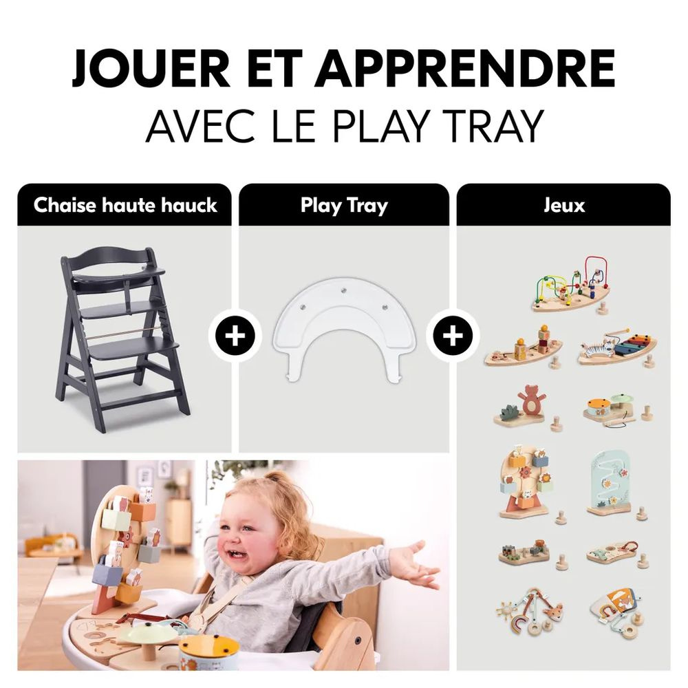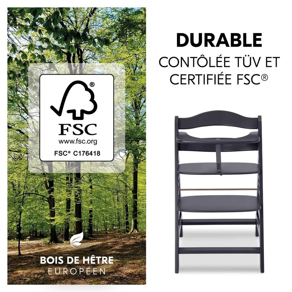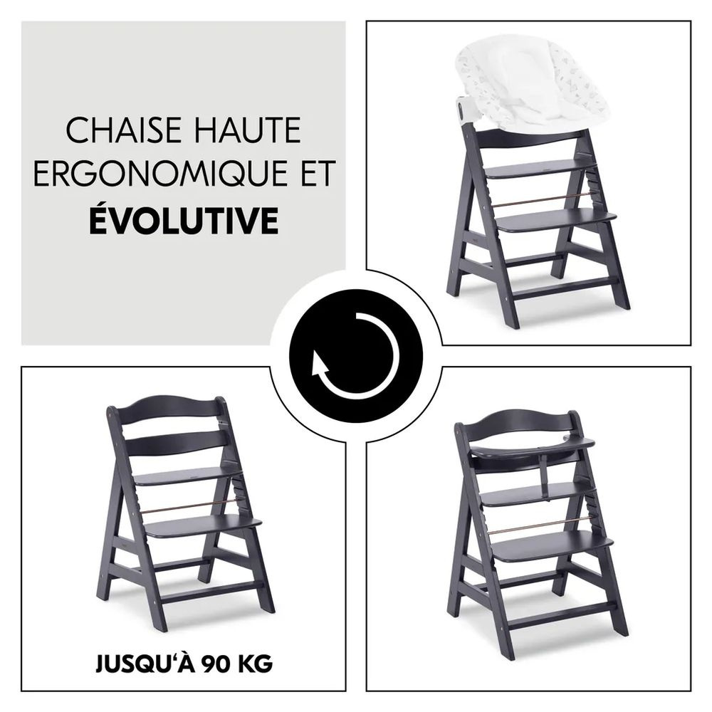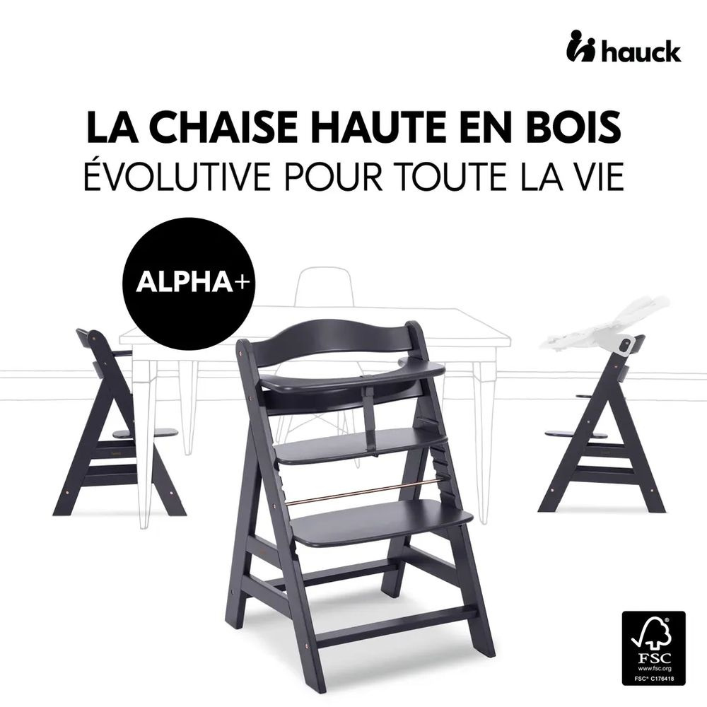 La chaise haute évolutive Alpha+ Noire avec transat new born set plus de la marque Hauck. Elle allie toutes les qualités nécessaires pour être l'une de vos chaises de sécurité préférée. Elle grandit avec votre enfant puisqu'elle a la capacité de soutenir un bébé de 6 mois à un adulte de 90kg. Puis l'on recherche avant tout de la sécurité pour son enfant... C'est pourquoi la chaise Alpha+ a été conçue en bois de hêtre robuste. Impossible pour votre enfant de basculer. La chaise évolutive regorge plusieurs surprises pour permettre à votre enfant d'être autant confortable que bien installé. En effet, l'assise et le repose-pied sont réglables très facilement. Puis, est inclus un harnais de sécurité en 5 points, une sangle d'entrejambes et un arceau de sécurité. Pour offrir à son enfant, on recherche des matériaux de qualité... la chaise est fabriquée en bois de hêtre européen issu de l'exploitation durable. On vous l'avait bien dit, la chaise haute Alpha+ allie toutes les qualités nécessaires !