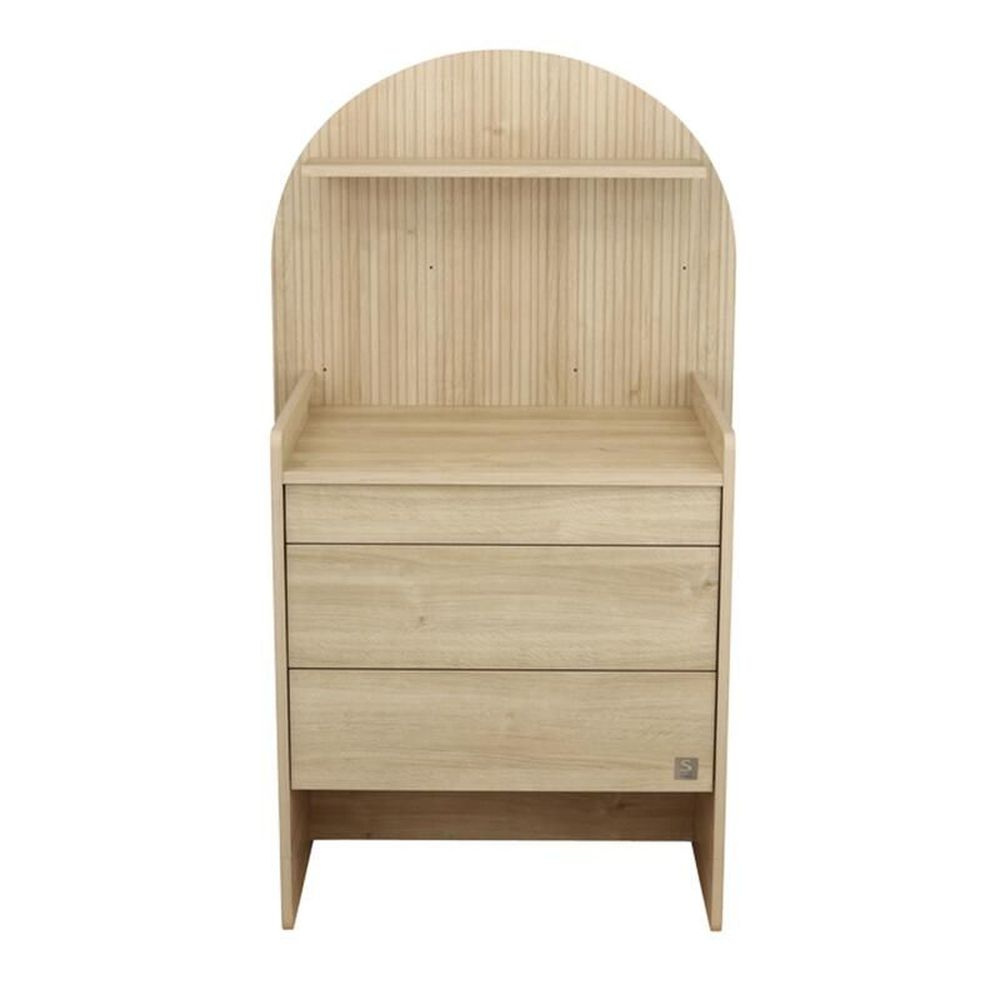 Cette commode est le complément parfait du lit que nous venons d'évoquer. Elle incarne la philosophie de la marque : un design durable qui s'adapte aux différentes étapes de la vie de l'enfant. Dans un premier temps, le meuble sert de station de change sécurisée et de rangement pour les vêtements de bébé. Un plan à langer (vendu séparement) se fixe sur le dessus de la commode. Il est sécurisé par des rebords pour éviter tout risque de basculement. Elle dispose de 3 grands tiroirs spacieux, équipés d'un système de fermeture douce ("Soft Close") pour éviter de se pincer les doigts et pour ne pas réveiller bébé avec un bruit sec. On retrouve les pieds en hêtre verni et les poignées intégrées qui font le charme de la gamme Arche. C'est la particularité de la gamme évolutive Sauthon. Lorsque l'enfant grandit et a besoin d'un espace de travail, la structure peut être réagencée pour devenir un véritable bureau junior. Le plateau offre une surface de travail confortable pour les premiers devoirs ou les activités créatives.