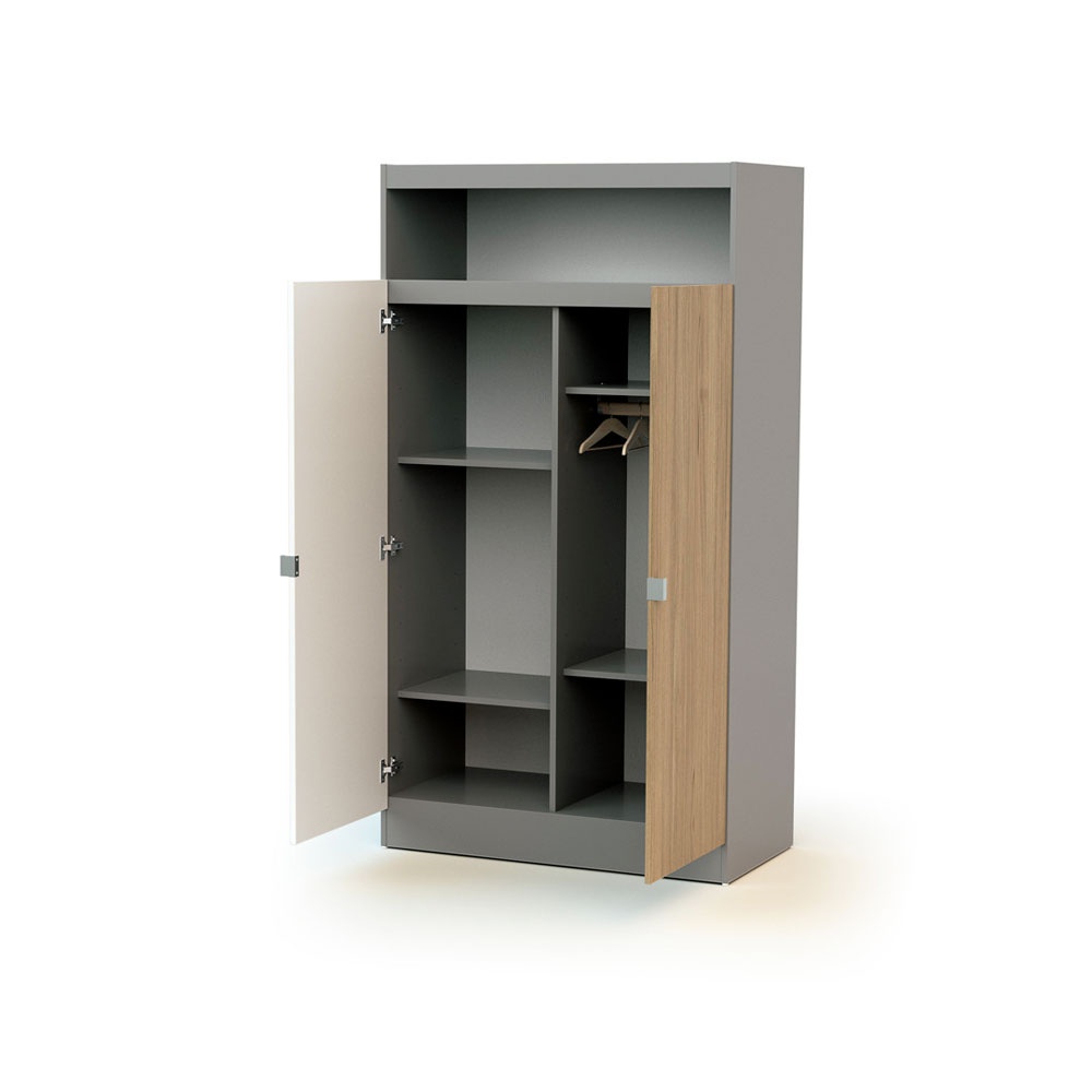 L'armoire sera parfaite pour ranger les affaires de votre enfant ! Cette armoire AT4 possède deux portes et une niche. À l'intérieur se trouve une penderie et six tablettes dont 4 réglables.