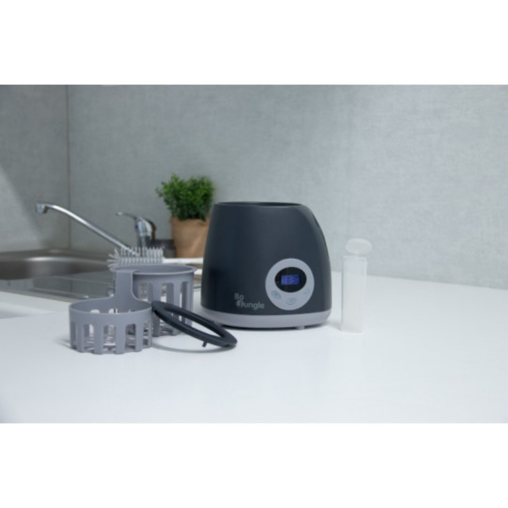 Grâce au distributeur d’eau inclus, vous pouvez facilement ajouter de l’eau au chauffe-biberon. Placez ensuite votre biberon dans le panier qui l’accompagne et fermez le à l’aide de la bague de réglage si nécessaire. La vapeur chaude reste ainsi autour du biberon et le temps de chauffe est accéléré. Choisissez ensuite la durée souhaitée, qui peut aller de 1 à 12 minutes. Lorsque le temps est écoulé ou qu’il n’y a plus d’eau, vous entendez une alarme. N’oubliez pas de bien secouer la bouteille pour permettre à la chaleur de se propager.