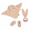 Coffret de naissance pêche de la marque Kaloo. Ce coffret de naissance contient 1 anneau de dentition, 1 paire de chaussons en forme de lapin et 1 doudou lapin. C'est un très beau cadeau à offrir. Il est livré dans un beau coffret.