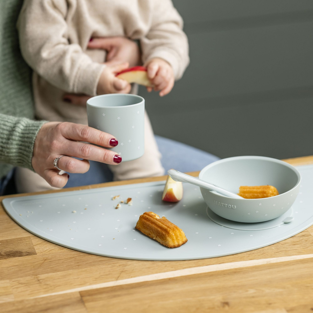 Le Coffret repas 4 pièces en silicone vert /etoile de chez Nattou. Le coffret repas 4 pièces est un grand classique pour accompagner les premiers repas de bébé avec douceur et praticité. Conçu en silicone de haute qualité, il mise sur un design épuré et une ergonomie pensée pour l'apprentissage de l'autonomie.