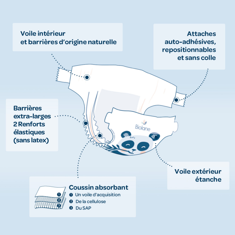 Optez pour le pack 1 mois de couches enfant taille 5 de la marque Biolane. Offrez à votre petit douceur, sécurité et protection optimale avec le pack 1 mois de couches Biolane. Conçues pour les nouveau-nés de 11 à 25 kg, ces couches garantissent jusqu’à 12 heures d’absorption, préservant ainsi la peau délicate de votre enfant des irritations et de l’humidité. Fabriquées en France et élaborées avec des matières en contact avec la peau 100% d’origine naturelle, elles assurent un confort exceptionnel tout en respectant l’environnement. Leur barrière anti-fuite et leur système de fixation ajustable garantissent une parfaite tenue, permettant à votre petit de bouger librement sans risque de fuites. Ce pack de 120 couches (3 paquets de 40 couches) est idéal pour assurer 1 mois de changes.
