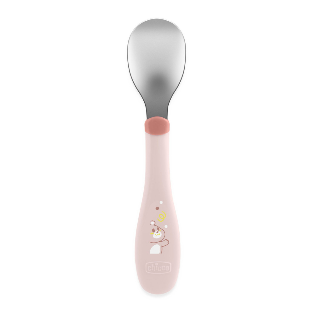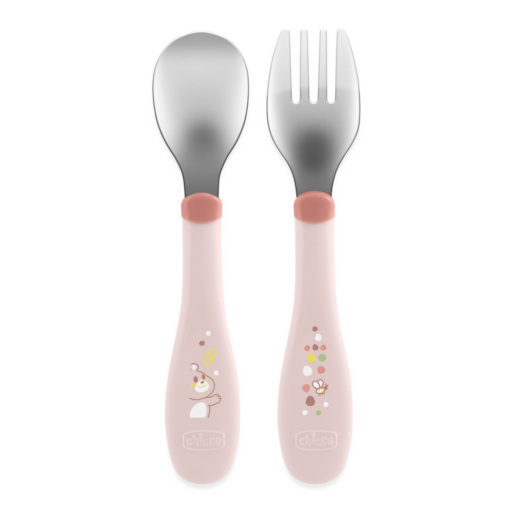 Les Couverts en métal rose de chez Chicco. Ces couverts sont spécialement conçus pour accompagner l'enfant dans la phase de transition où il délaisse les couverts en plastique pour des couverts plus robustes, similaires à ceux des adultes, tout en restant parfaitement adaptés à ses besoins. ls sont parfaits pour aider l'enfant à développer sa motricité fine et à manger de manière autonome, en le préparant aux couverts d'adultes sans le frustrer.