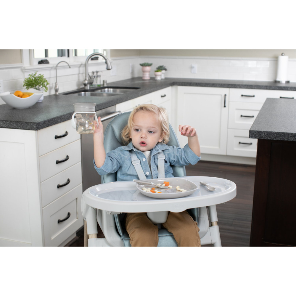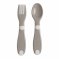 Les Couverts gris de chez Chicco. Les couverts sont conçus pour être faciles à saisir et à tenir par la main encore peu habile de l'enfant. La forme et la profondeur du cuilleron sont optimisées pour la petite bouche de l'enfant et pour que le contenu ne se renverse pas trop facilement entre l'assiette et la bouche. Les dents sont courtes et arrondies pour minimiser les risques de blessure tout en étant efficaces pour piquer les aliments mous.