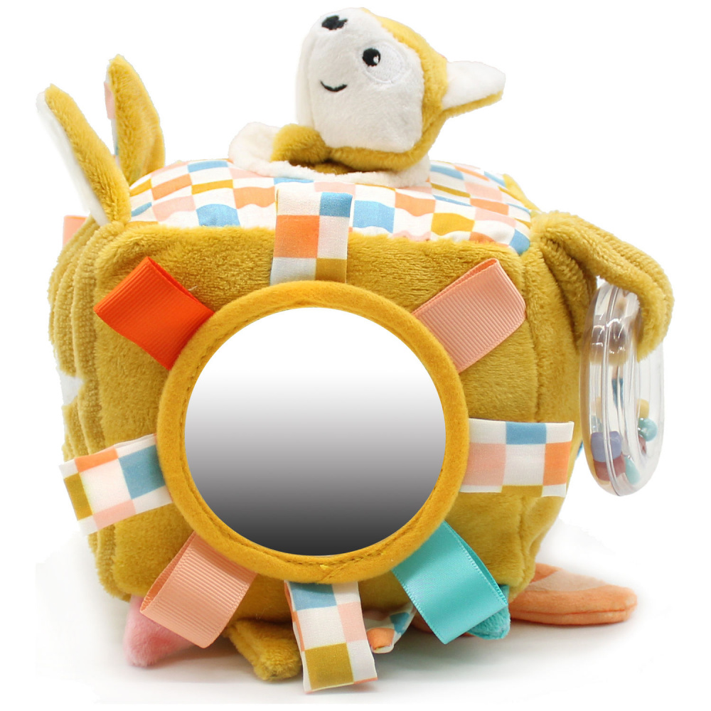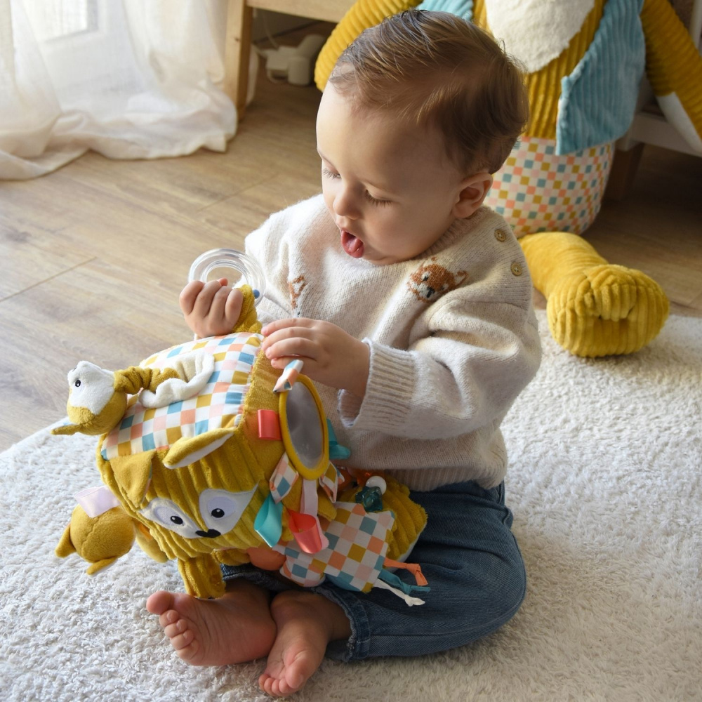 Utilisable dès la naissance, il stimulera les sens de bébé comme la vue avec les multiples couleurs, le toucher grâce aux différentes matières et l'ouïe avec le miroir, le papier bruissant, le hochet et l'anneau de dentition.