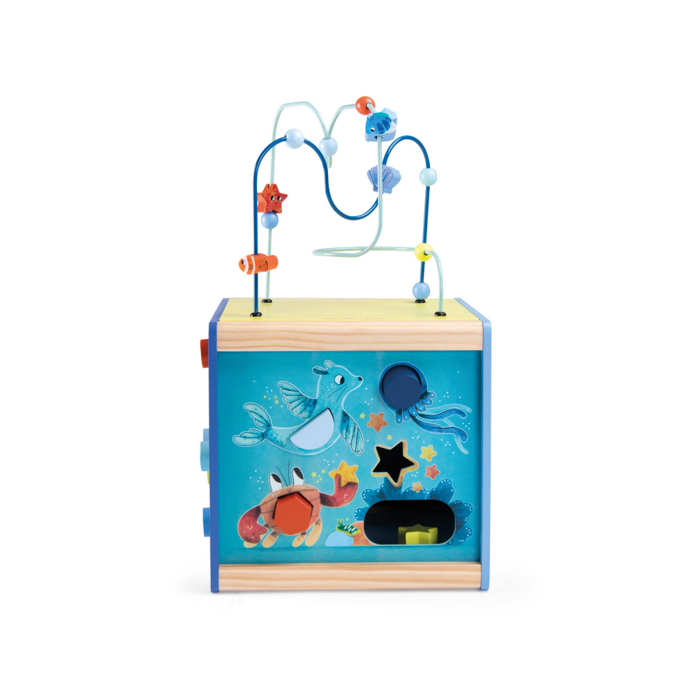 Découvrez le Cube d'activités les aventures de paulie de la marque Moulin Roty. Grâce à ses labyrinthes coulissants, son jeu de formes, d’engrenages et son boulier, ce cube d’activités est un accessoire indispensable pour développer la motricité fine de votre enfant. Il prendra plaisir à jouer avec les animaux marins présents sur le cube. Aussi, avec les différentes activités et les sons, votre enfant va éveiller tous ses sens.