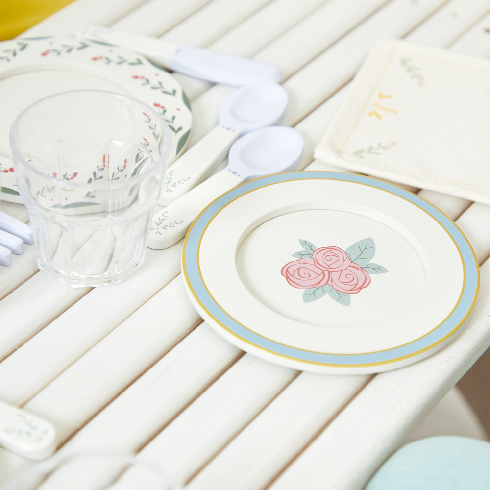 Dinette en valisette mamie soleil de la marque Janod. Ce jeu d'imitation contient un service complet de repas pour 4 personnes. Votre enfant trouvera dans cette valisette : 4 assiettes en bois, 4 serviettes en tissu, 4 sets de couvert (cuillères, fourchettes et couteaux) et 4 verres en plastique. Une fois qu'il aura fini de jouer avec, il pourra ranger tous les accessoires dans la valisette.