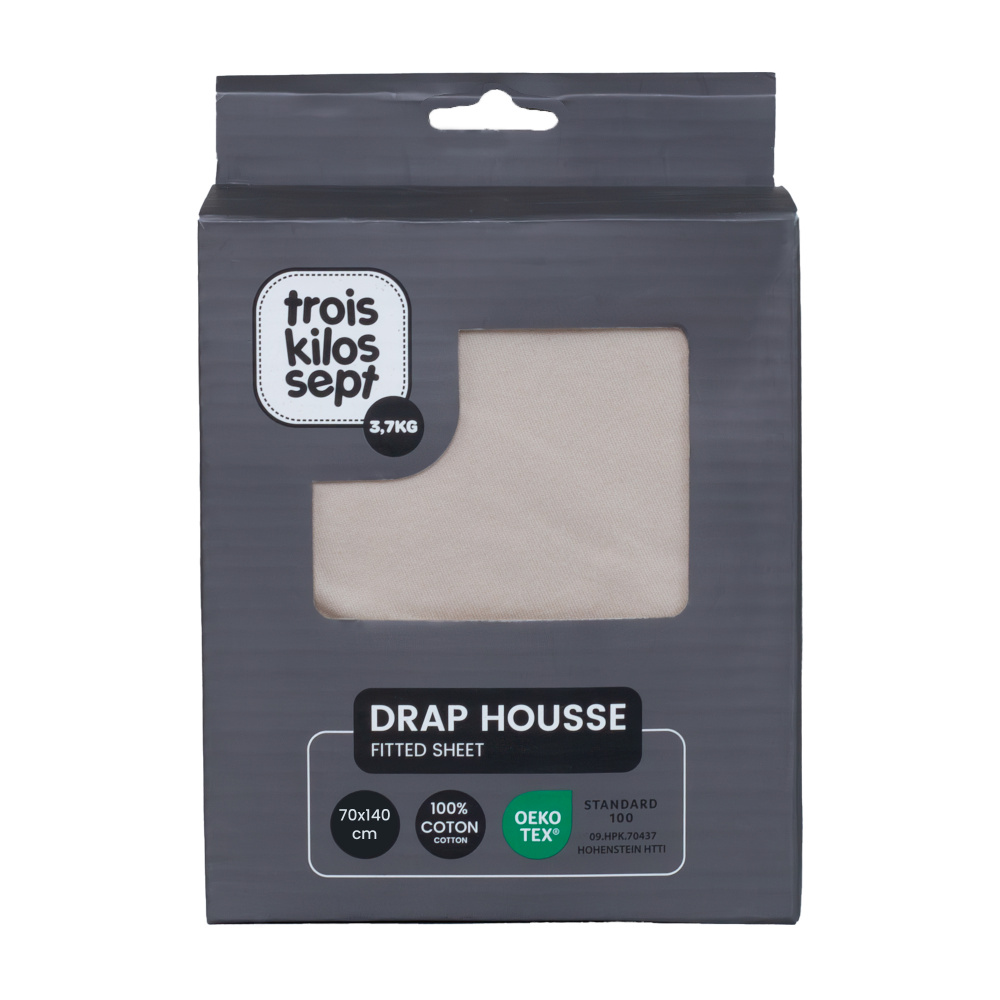 Le Drap housse 70*140 - sable de chez Trois Kilos Sept. Fabriqué en coton, il apporte la douceur et le confort nécessaires à la peau sensible de bébé pendant la sieste ou la nuit.