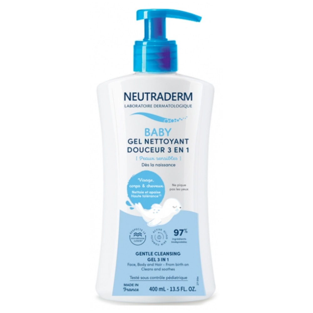 Le Gel Nettoyant Douceur 3en1 de Neutraderm Baby est un soin d'hygiène quotidienne essentiel pour les nourrissons et les enfants. Spécifiquement formulé pour les peaux délicates, ce gel sans savon nettoie en un seul geste le corps, le visage et les cheveux. Il intègre le complexe breveté "Active Oligo Skin", un actif marin apaisant issu de l'eau d'Iroise, qui reminéralise l'épiderme et renforce la barrière cutanée.