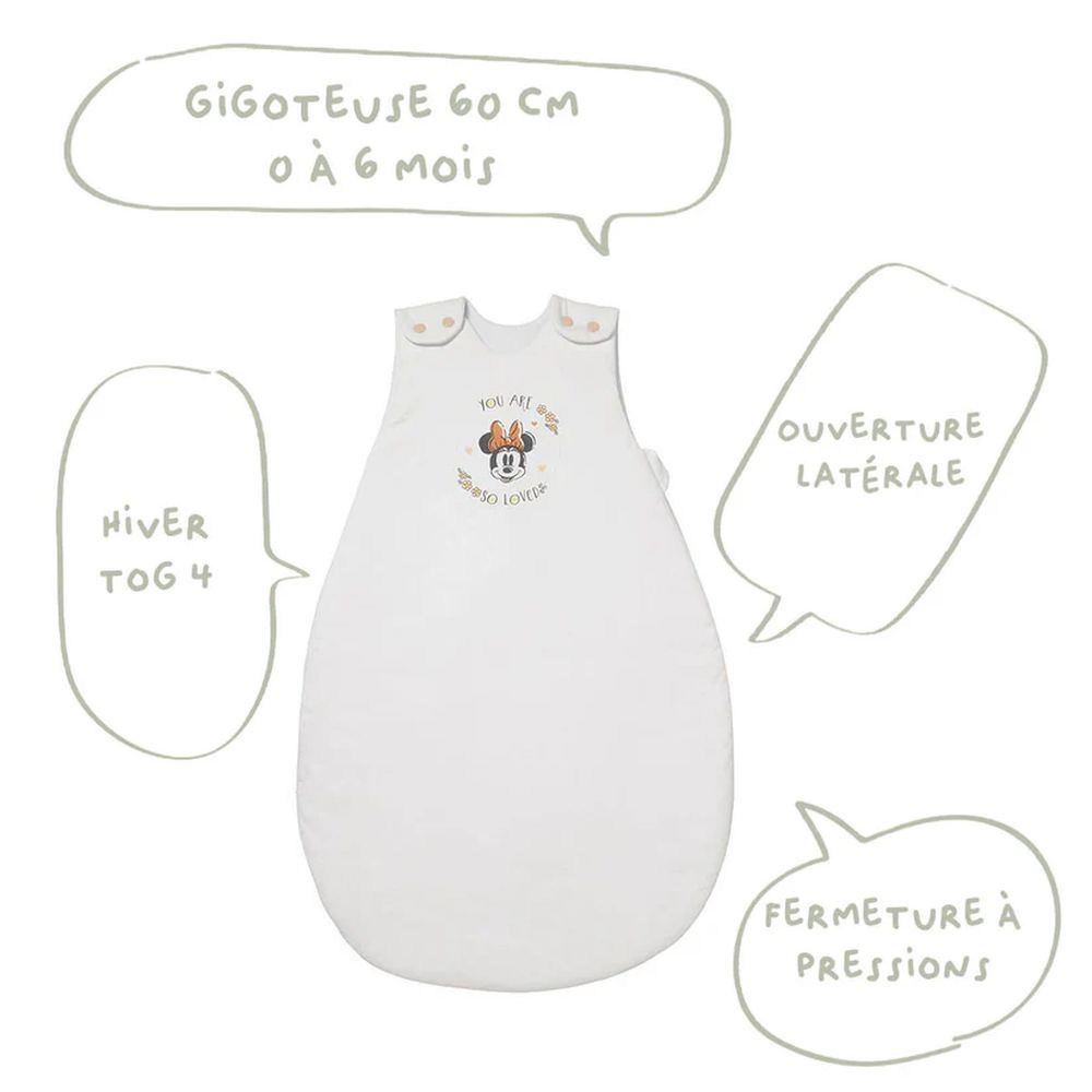 Découvrez cette gigoteuse Minnie naissance 0-6 mois de la marque Babycalin. Idéal pour envelopper et protéger votre petit bout pour des nuits paisibles, confortables et en toute sécurité !