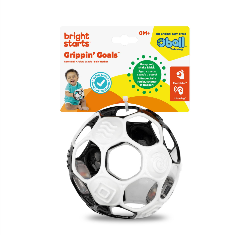 Découvrez la Hochet ballon de foot - noir/blanc de Oball. Conçu pour être facilement saisi même par les plus petits doigts, ce jouet pour bébé stimule le développement de la motricité fine à chaque secousse. Le design noir et blanc est idéal pour les premiers mois de bébé, car ces contrastes forts sont les seuls que les nourrissons distinguent nettement au début de leur vie. Le bébé peut la mordre (matériau sûr sans BPA), la faire rouler, la lancer ou même essayer de donner des coups de pied dedans. La balle contient de petites perles multicolores qui produisent un son de cliquetis amusant lorsque l'enfant secoue le jouet, stimulant ainsi l'ouïe.