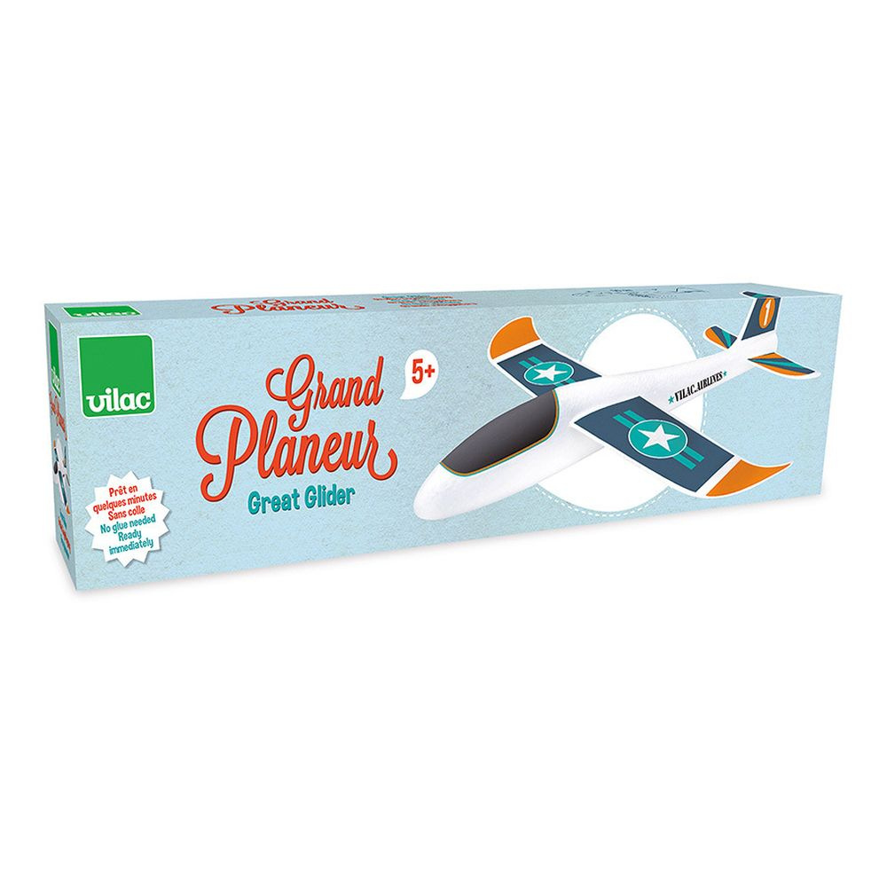 Jeu pour enfant grand planneur xl de la marque Vilac. Votre enfant va s'amuser en extérieur à lancer ce planneur et le voir voler. Ce produit est livré en kit et est facile à monter. Des stickers sont collés sur le planneur pour le décorer.
