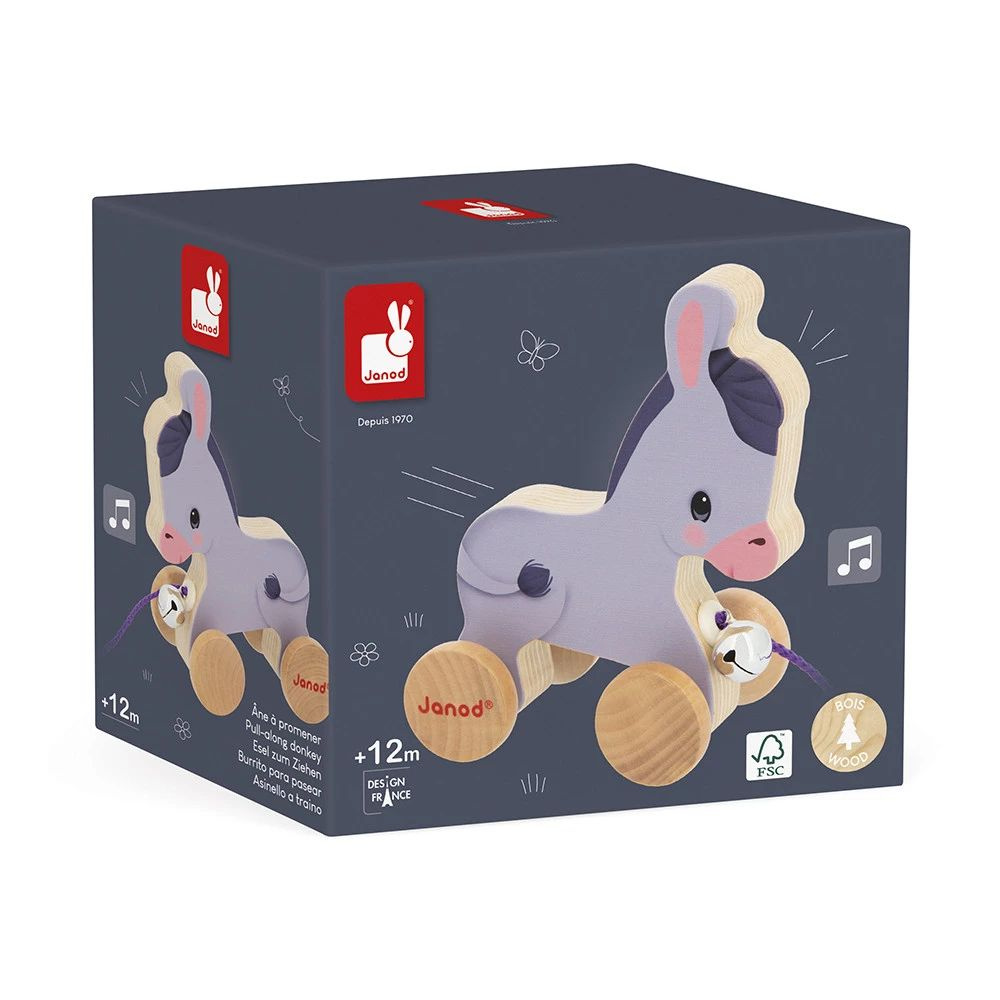 Jouet à tirer en bois âne de la marque Janod. Ce petit âne en bois tout mignon accompagnera votre bébé dans ses premiers pas. Il pourra le tirer avec la ficelle de 50 cm. Il fera beaucoup amuser quand il entendra tinter la clochette en promenant son petit âne.