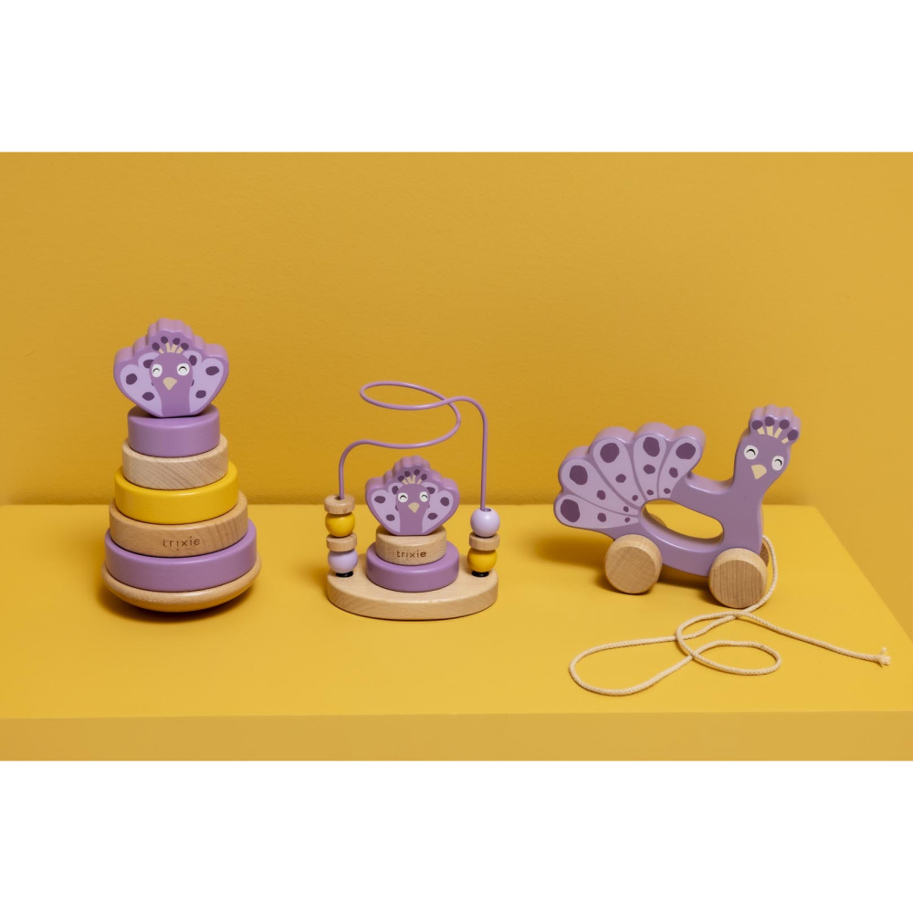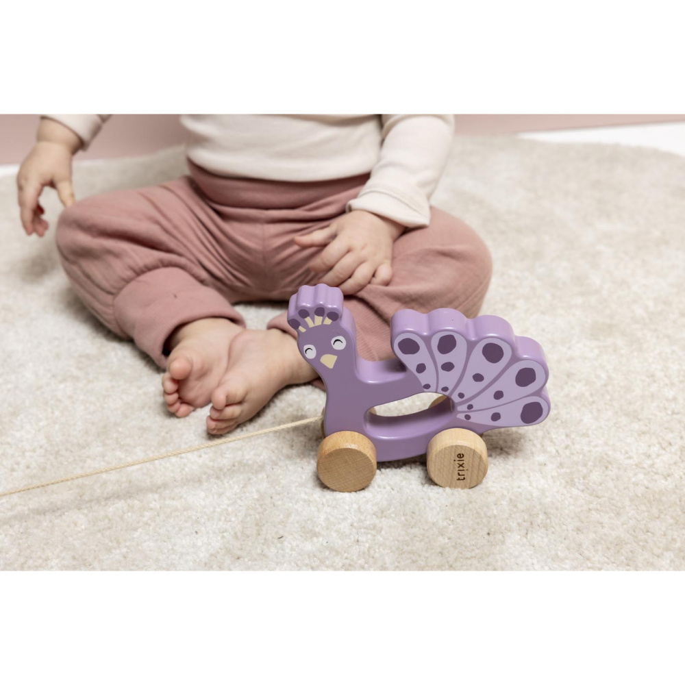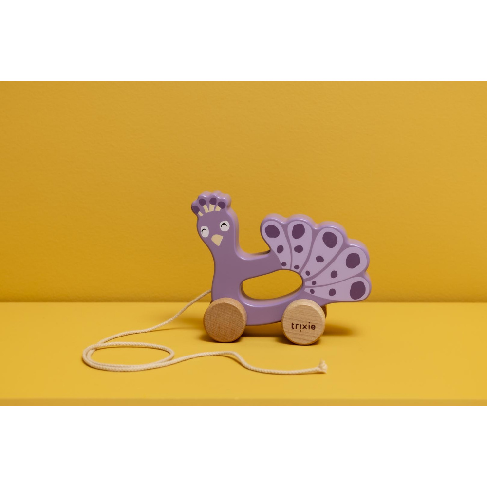 Ce jouet en bois à tirer Mrs. Peacock de trixie fera le bonheur de votre tout-petit. Il sera le témoin privilégié des premiers pas de votre enfant. En tirant sur la cordelette, ce jouet d'éveil se met à rouler. Il accompagnera votre bébé durant de longues heures.