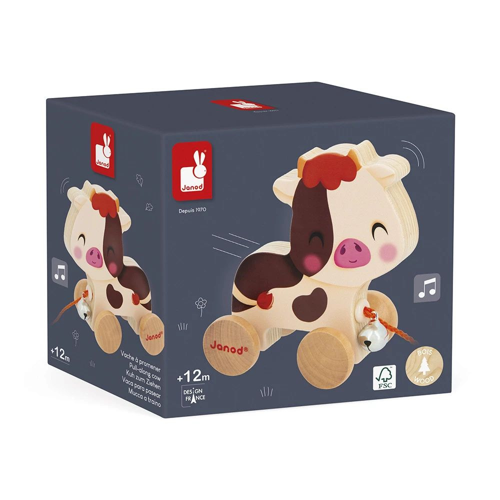 Jouet à tirer en bois vache de la marque Janod. Cette petite vache en bois toute mignonne accompagnera votre bébé dans ses premiers pas. Il pourra la tirer avec la ficelle de 50 cm. Il fera beaucoup amuser quand il entendra tinter la clochette en promenant sa petite vache.