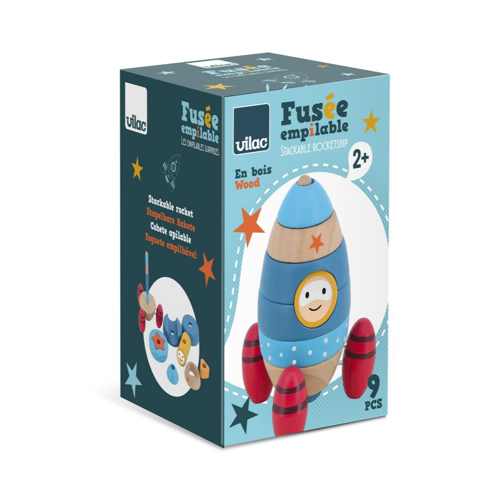 Jouet d'éveil en bois à empiler fusée de la marque Vilac. Ce jeu en bois à empiler est constitué d'un socle en bois avec 1 tige et 3 pieds en forme de boosters, 4 anneaux colorés dont 2 avec formes à encastrer, 1 astronaute en bois et 1 anneau supérieur. Sur la tige, votre enfant pourra s'aider des couleurs pour réaliser parfaitement la fusée. Grâce aux 3 pieds, la fusée à empiler sera très stable.