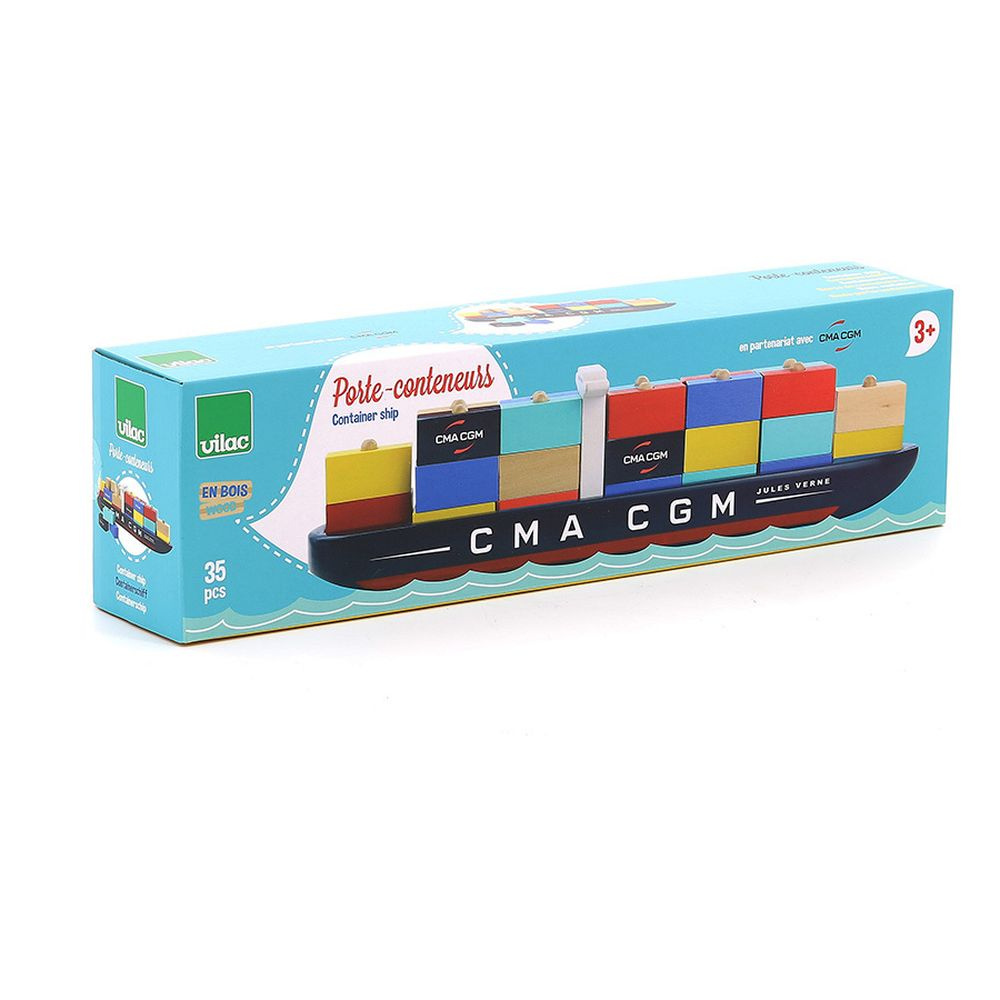 Jouet en bois pour enfant bateau porte-conteneurs jules verne de la marque Vilac. Ce bateau en bois est livré avec 34 conteneurs et une tour de contrôle. Votre enfant s'amusera à charger et décharger le bateau avec les conteneurs. Ce jouet en bois fait partie de la gamme Vilacity.