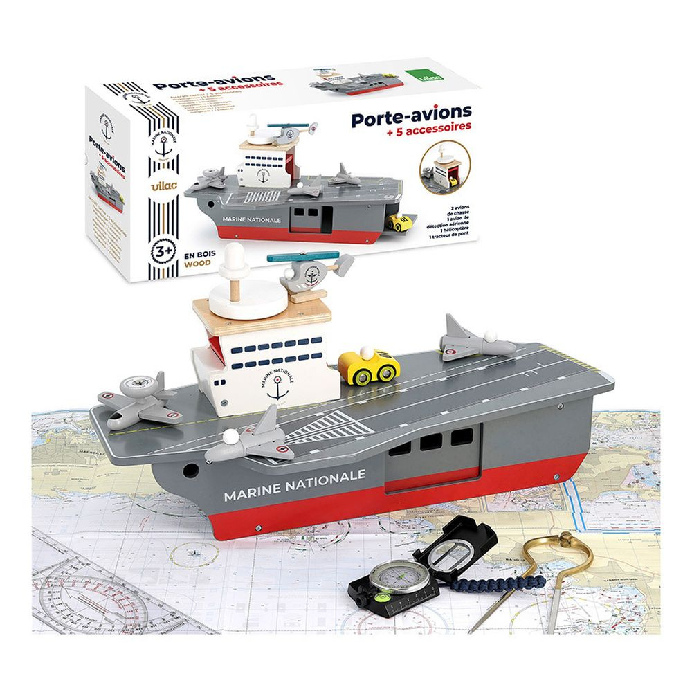 Jouet pour enfant porte-avions avec accessoires - marine nationale de la marque Vilac. Avec ce joli porte-avions, votre enfant s'amusera avec 2 rafales, 1 hawkeye, 1 hélicoptère et 1 véhicule de pont. Il y a pleins d'histoires à inventer sur ce porte-avions. Les ailes des avions se plient pour qu'ils puissent entre dans l'ascenseur et descendre se ranger dans le sous sol du bateau.