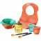 Ce coffret repas contient deux bols, un bavoir ramasse-miettes, une tasse anti-goutte, deux cuillères et deux pots de conservation.