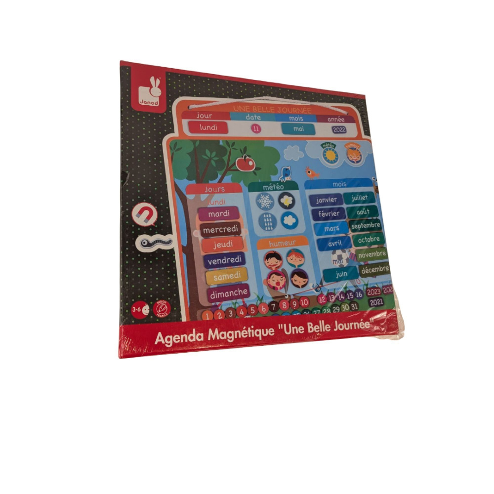 Craquez pour l'agenda magnétique de la marque Janod. Ce calendrier est idéal pour permettre à votre enfant d'appréhender en douceur le temps et les saisons. Il se compose d'un tableau à suspendre et de 71 magnets pour renseigner la date, la météo et l'humeur du jour. Ce jouet d'éveil ludique fera le bonheur de votre enfant. Ce tableau à suspendre habillera à merveille la chambre de votre tout-petit.