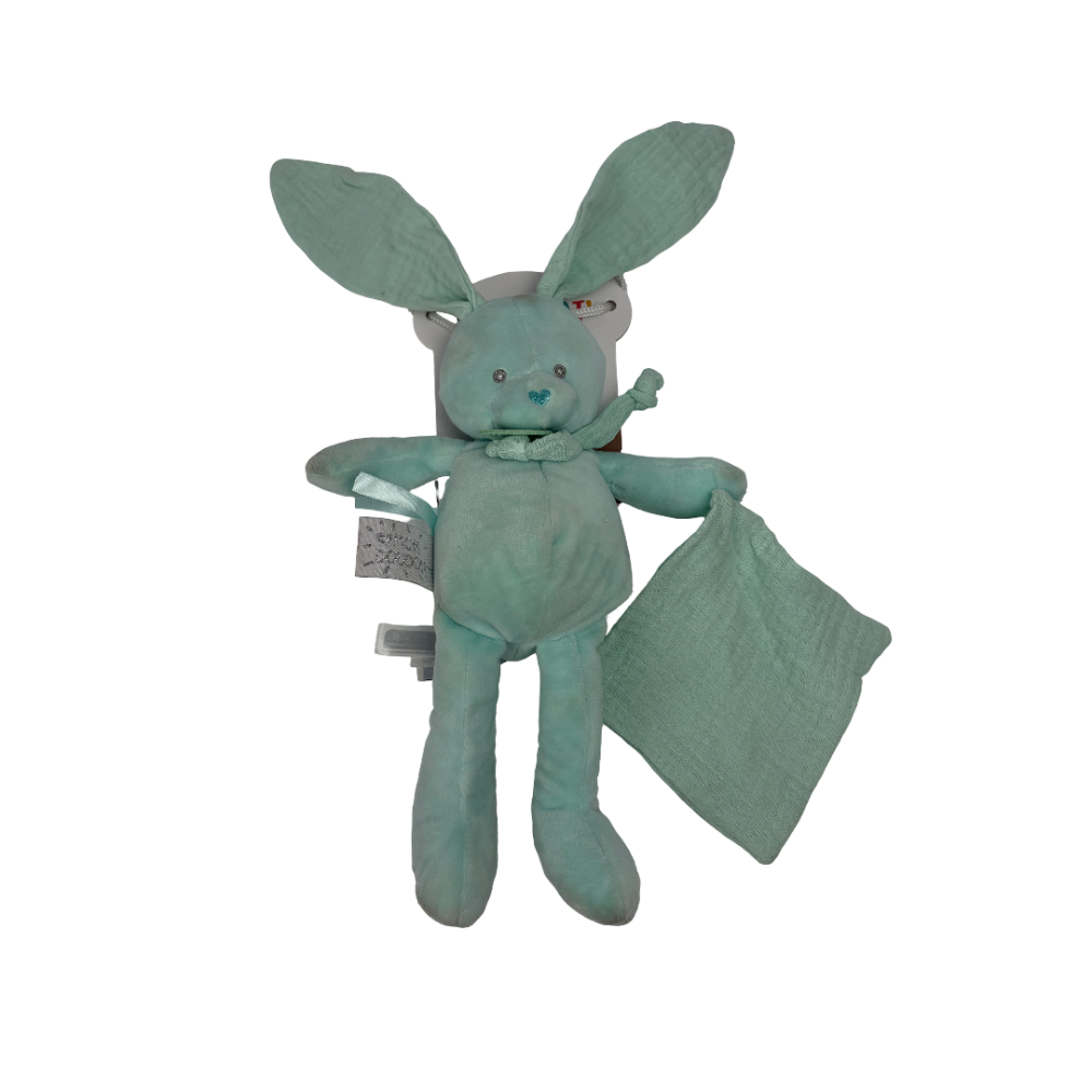 Le Pantin avec Doudou Lapin "Diabolo menthe" est un pantin très tendre. Composé d'une matière très douce spéciale bébé et de lange de coton pour le Doudou, les oreilles et les nouettes, il est totalement uni et de couleur menthe apaisante pour un esprit zen.