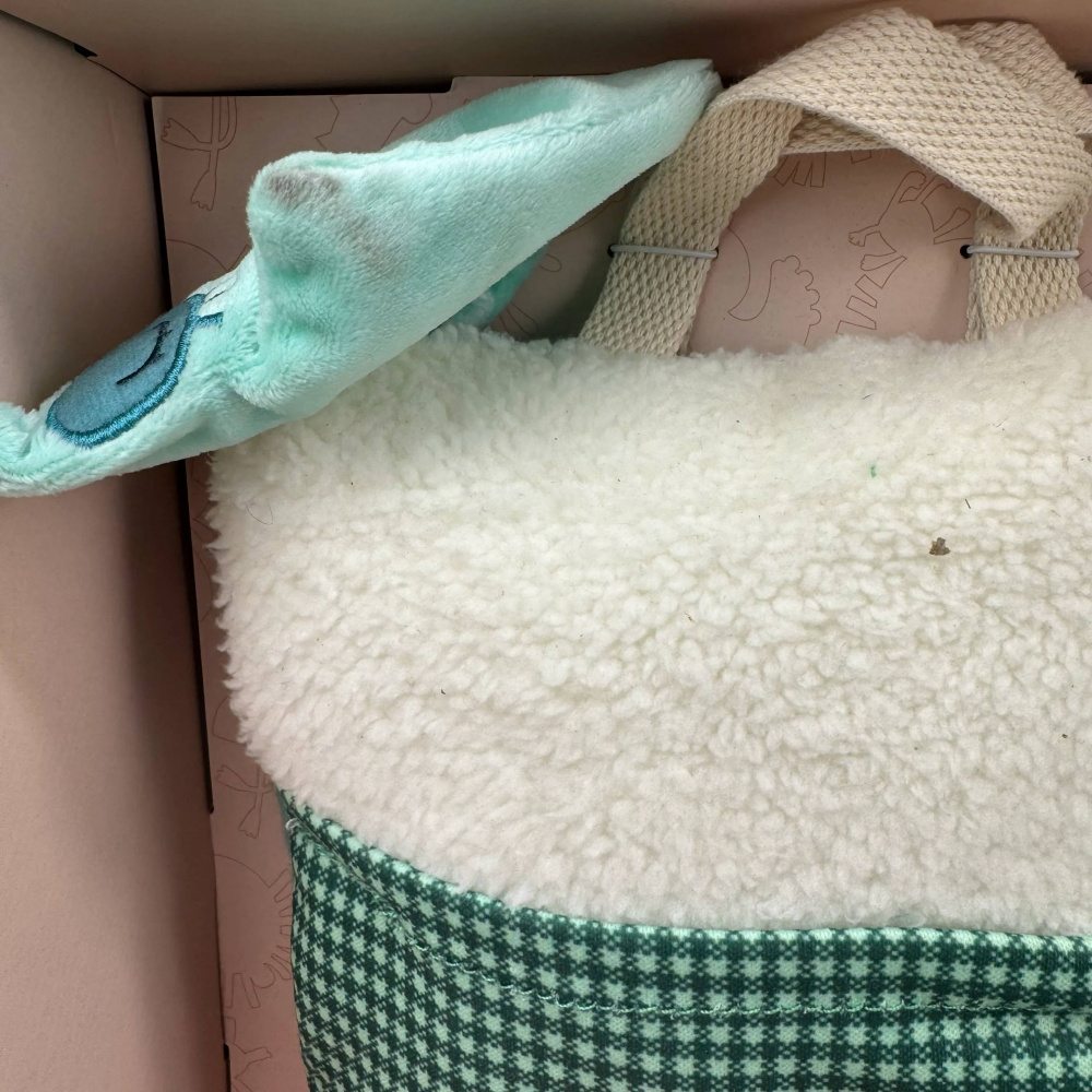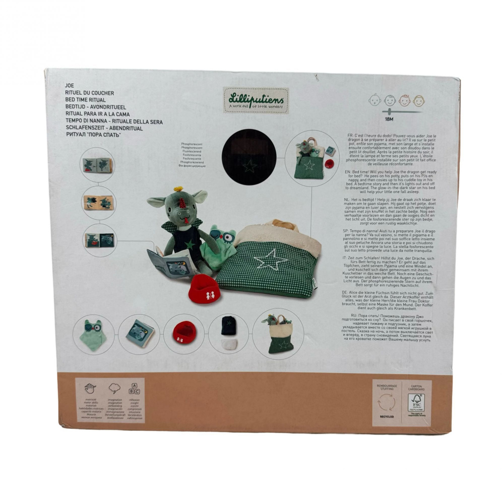 Peluche rituel soir Joe de la marque Lilliputiens. C'est un jeu d'imitation pour reproduire la routine du soir avec une peluche. Sur la couverture du lit de la peluche, il y a une étoile phosphorescente qui fera office de veilleuse