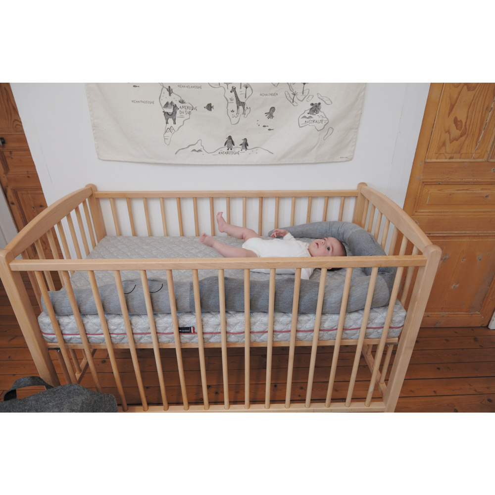 Pour que bébé fasse de beaux rêves, Combelle a conçu des lits dont le sommier à lattes galbées est réglable en hauteur (4 positions : 63 cm en position la plus basse).