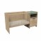- Lit bébé : Tête de lit et panneau galerie, en panneaux particules mélaminés décor Chêne doré, chants décor bois. 1 Galerie fixe, balustres ronds en hêtre vernis naturel. Sommier réglable en hauteur 3 positions en panneaux de particules mélaminés décor blanc, chants décor blanc.